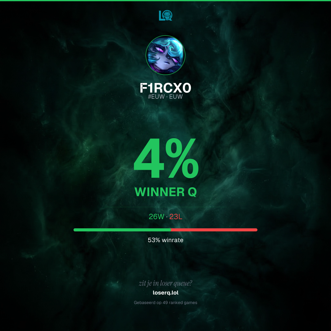 26 overwinningen, 23 nederlagen — een winrate van 53%.