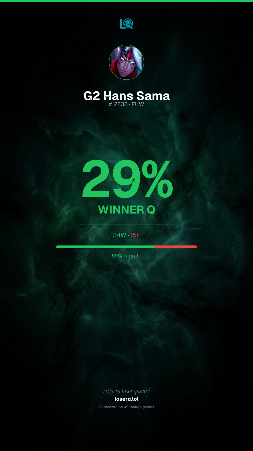 34 overwinningen, 15 nederlagen — een winrate van 69%. Sterke prestatie.