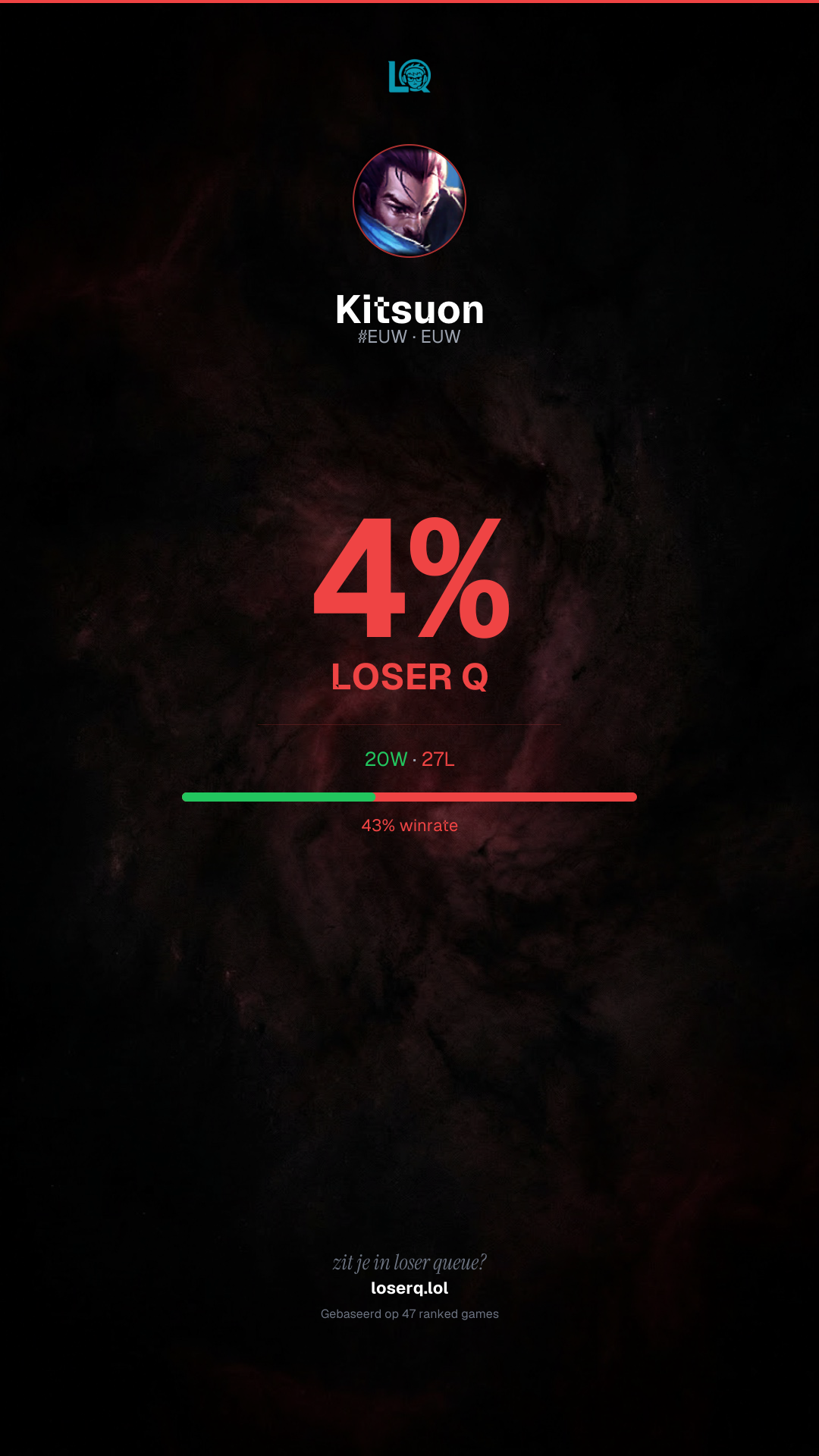 20 overwinningen, 27 nederlagen — een winrate van 42%. Een lastige periode.