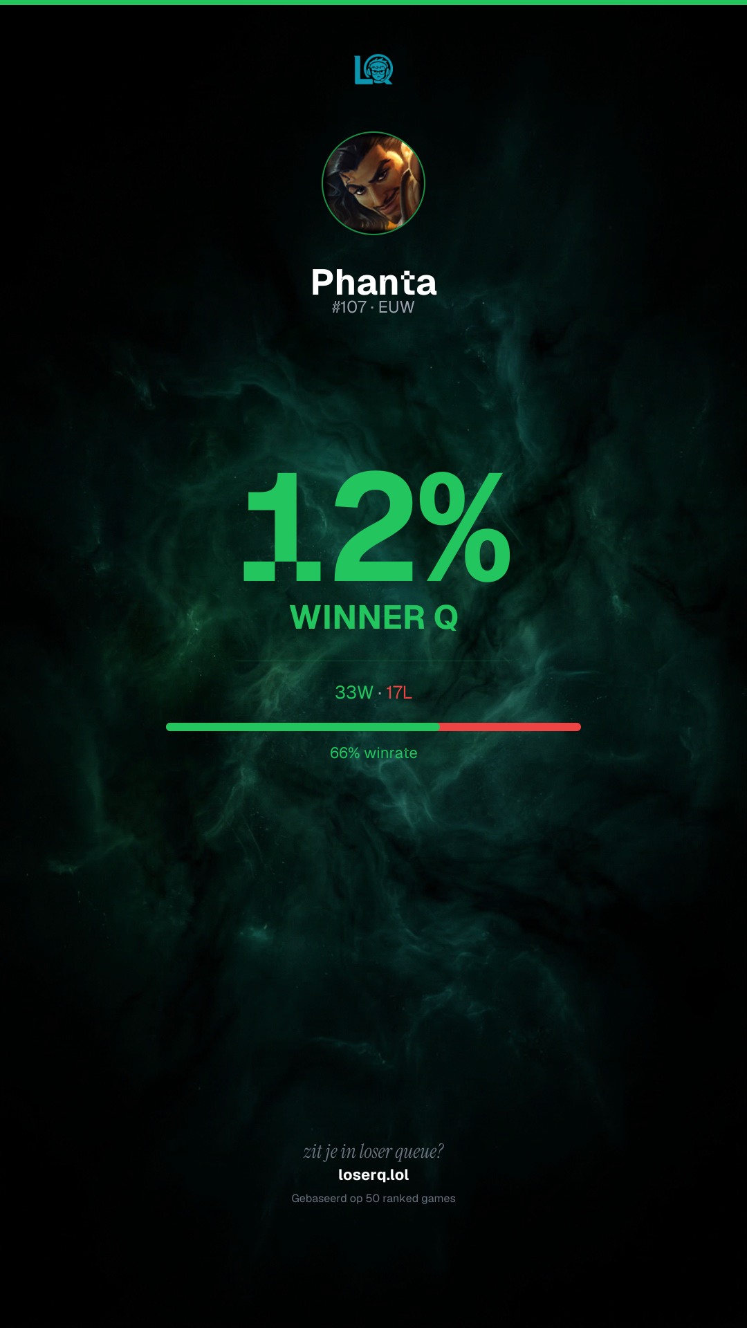 33 overwinningen, 17 nederlagen — een winrate van 66%. Sterke prestatie.