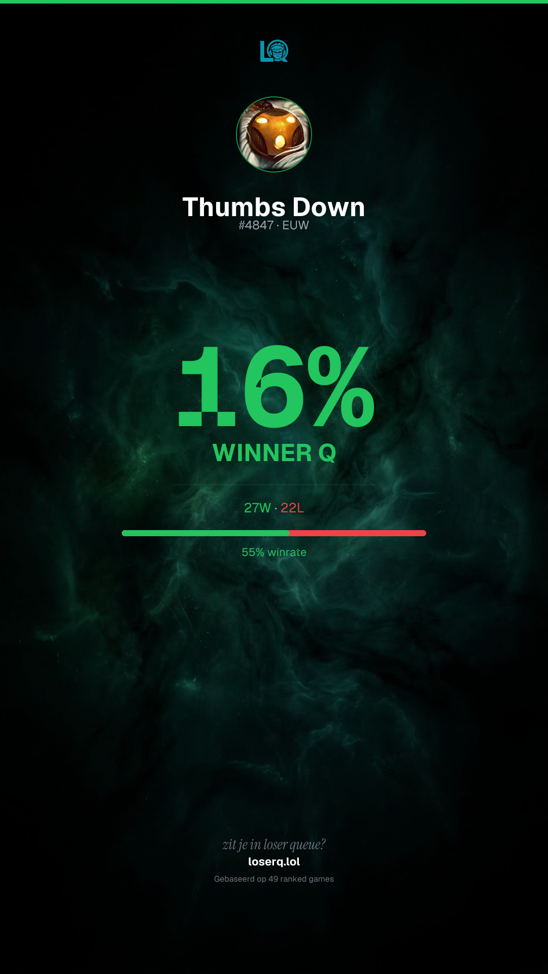 27 overwinningen, 22 nederlagen — een winrate van 55%. Sterke prestatie.