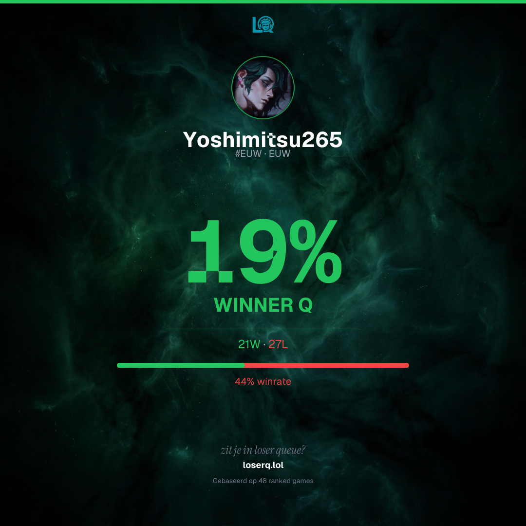 21 overwinningen, 27 nederlagen — een winrate van 43%. Een lastige periode.