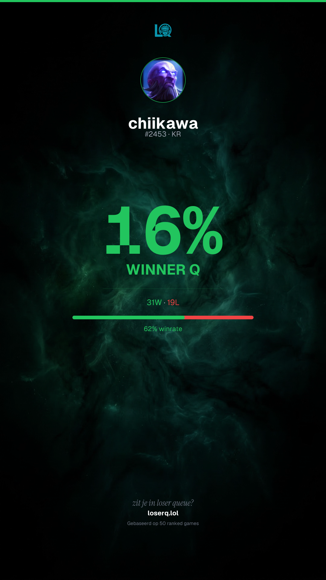 31 overwinningen, 19 nederlagen — een winrate van 62%. Sterke prestatie.