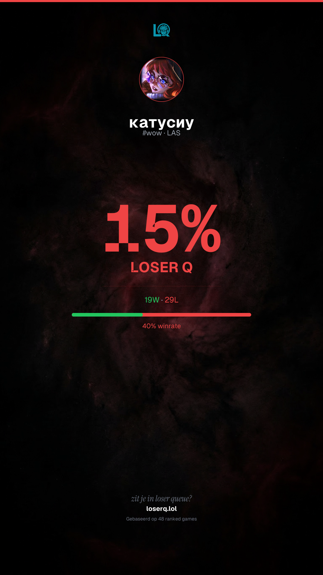 19 overwinningen, 29 nederlagen — een winrate van 39%. Een lastige periode.