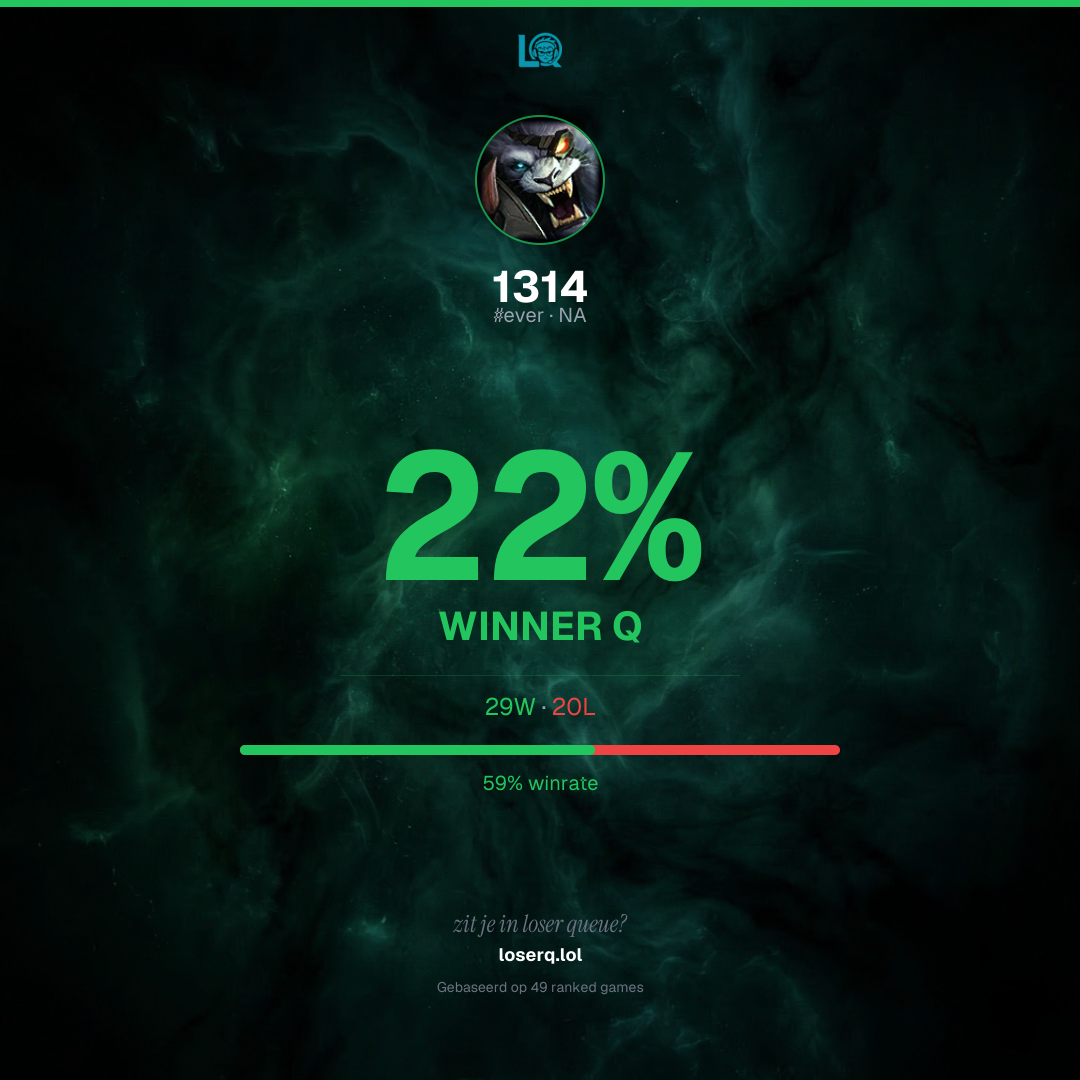 29 overwinningen, 20 nederlagen — een winrate van 59%. Sterke prestatie.