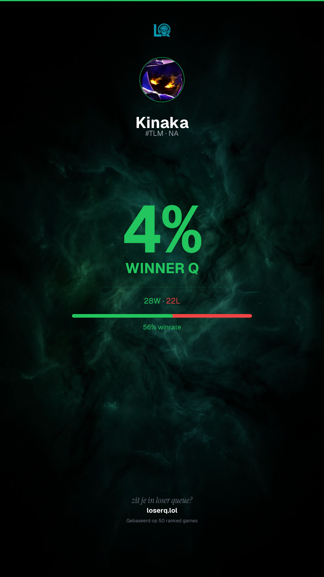 28 overwinningen, 22 nederlagen — een winrate van 56%. Sterke prestatie.