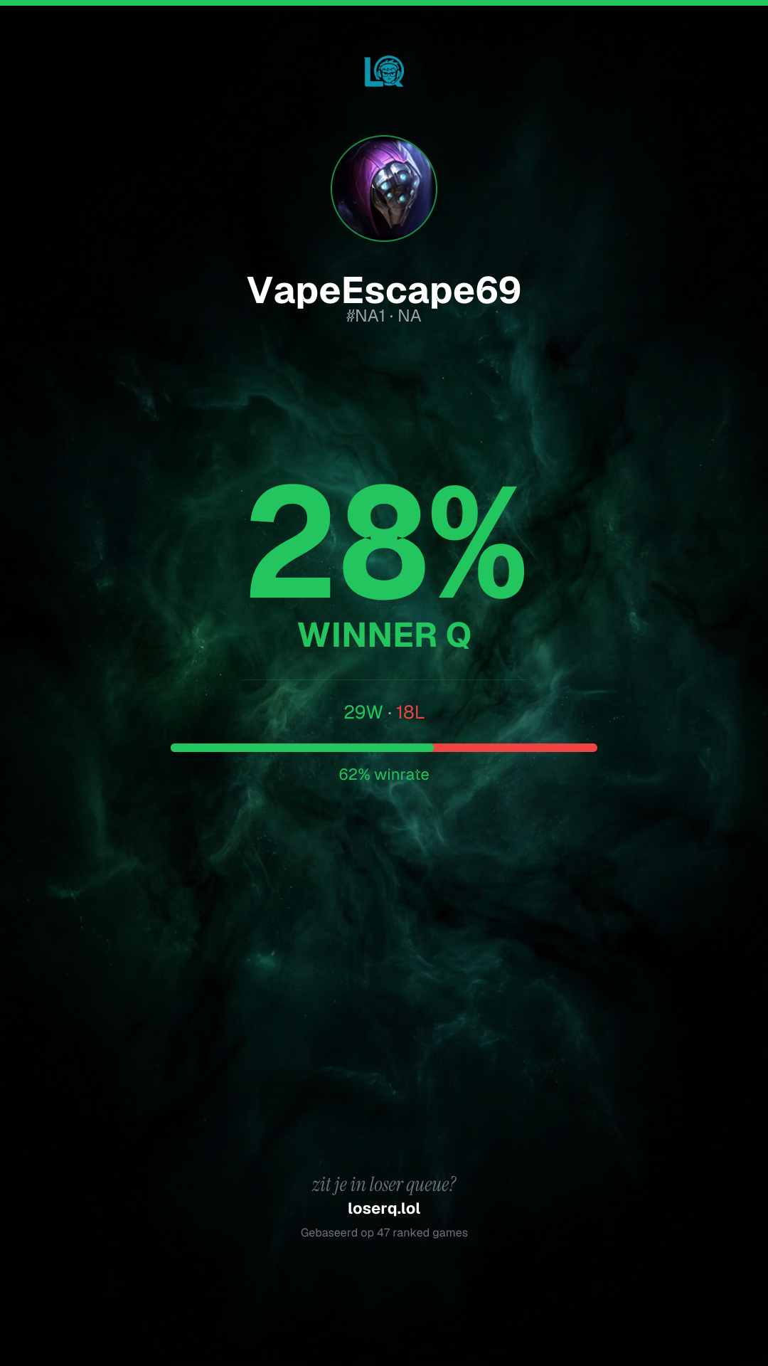 29 overwinningen, 18 nederlagen — een winrate van 61%. Sterke prestatie.