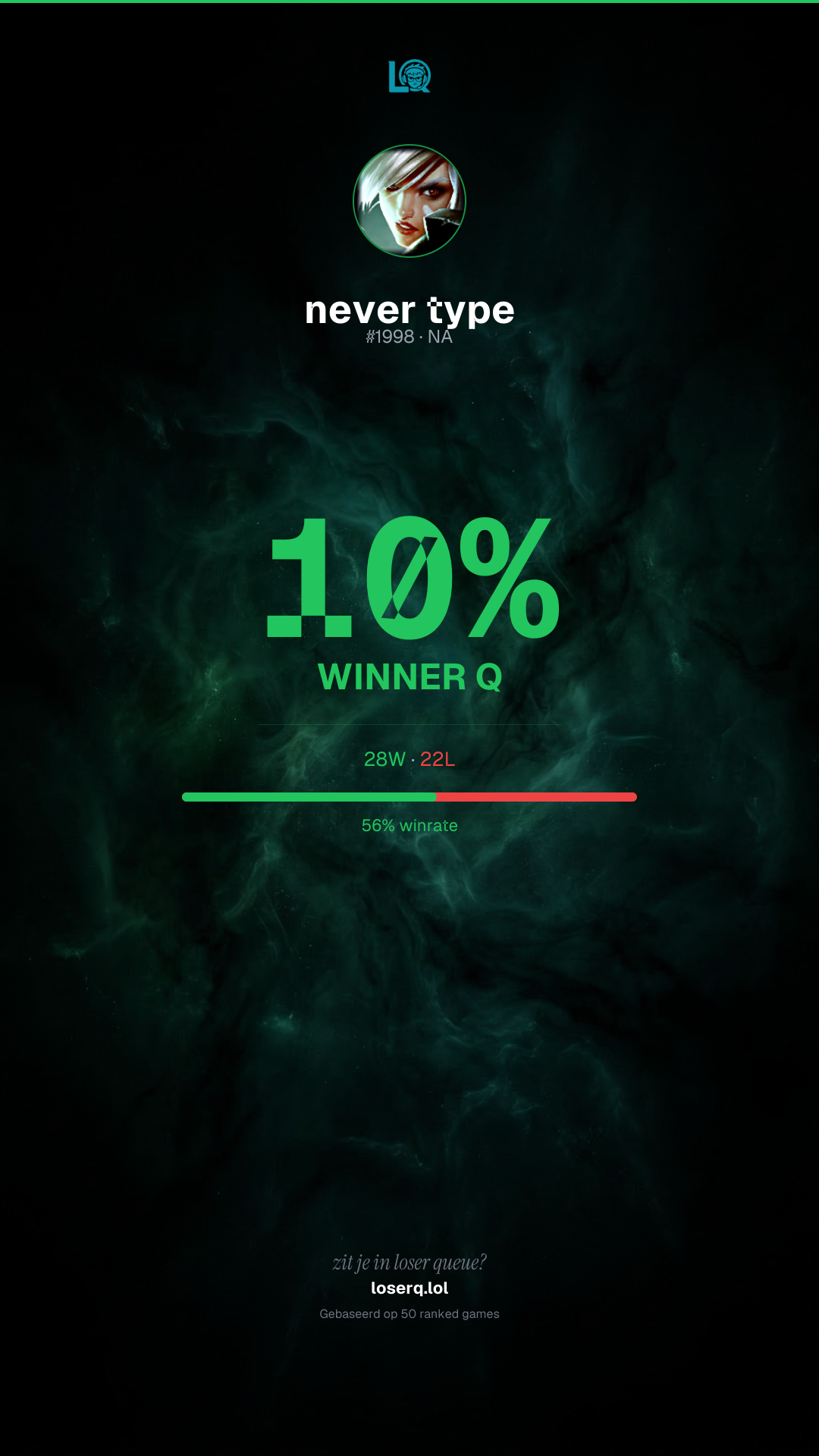 28 overwinningen, 22 nederlagen — een winrate van 56%. Sterke prestatie.