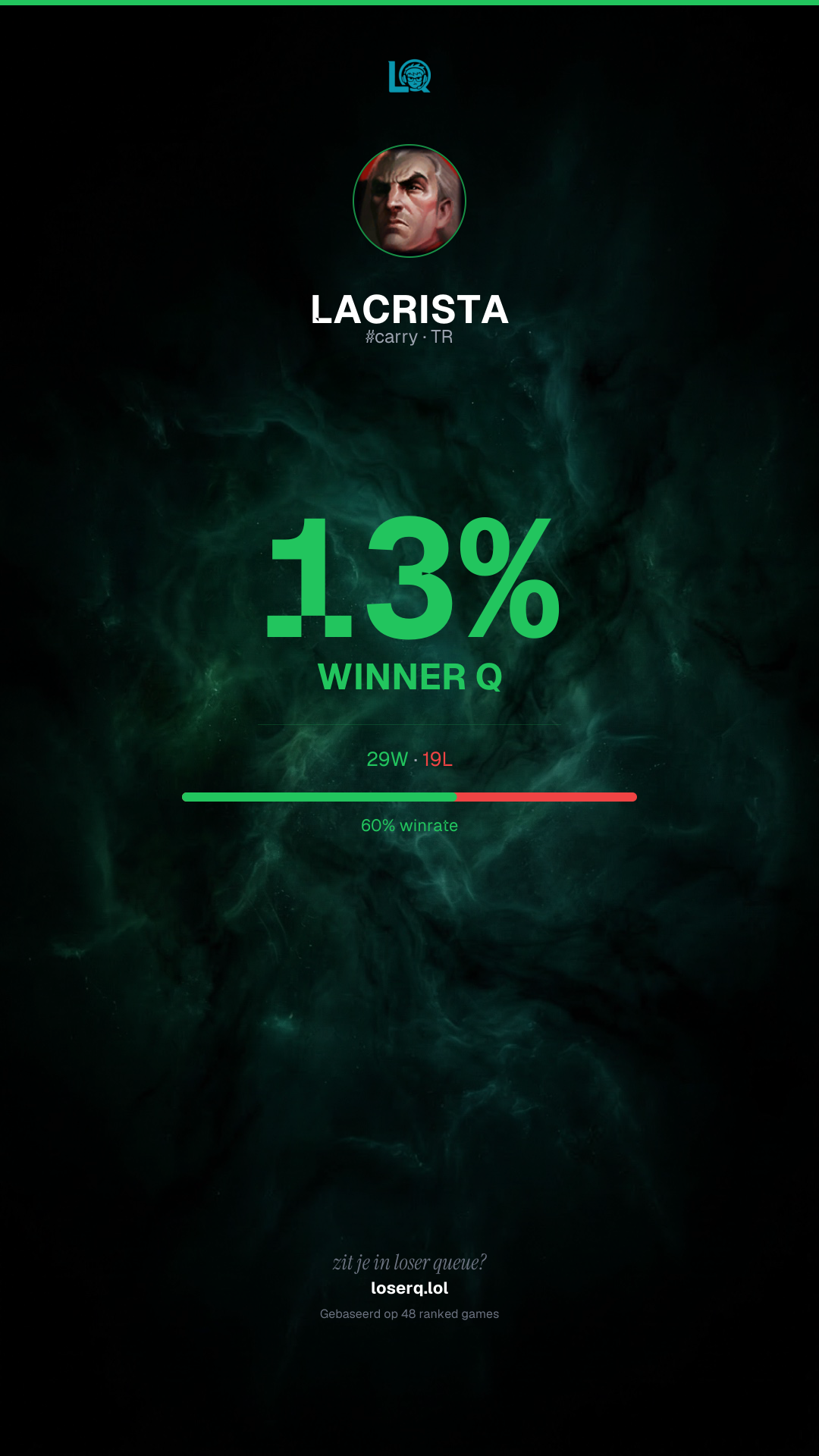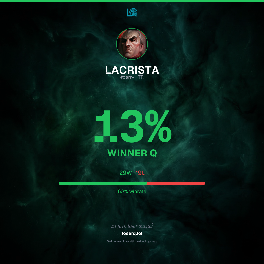 29 overwinningen, 19 nederlagen — een winrate van 60%. Sterke prestatie.