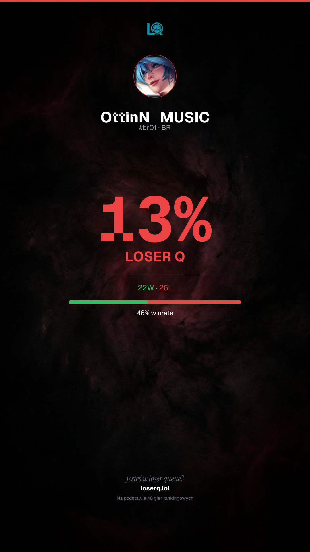 22 zwycięstw, 26 porażek — winrate 45%. Ciężki okres.
