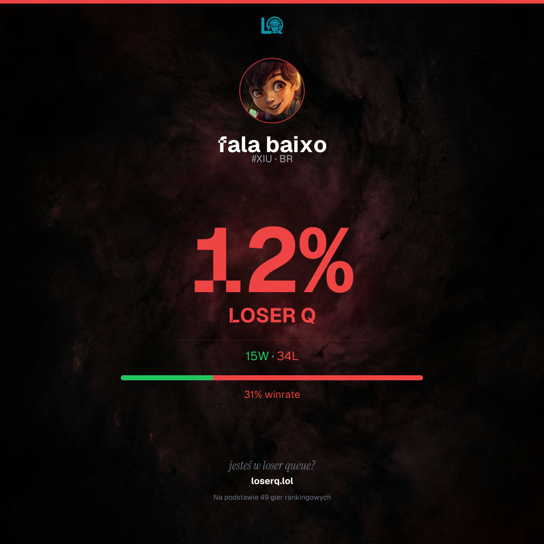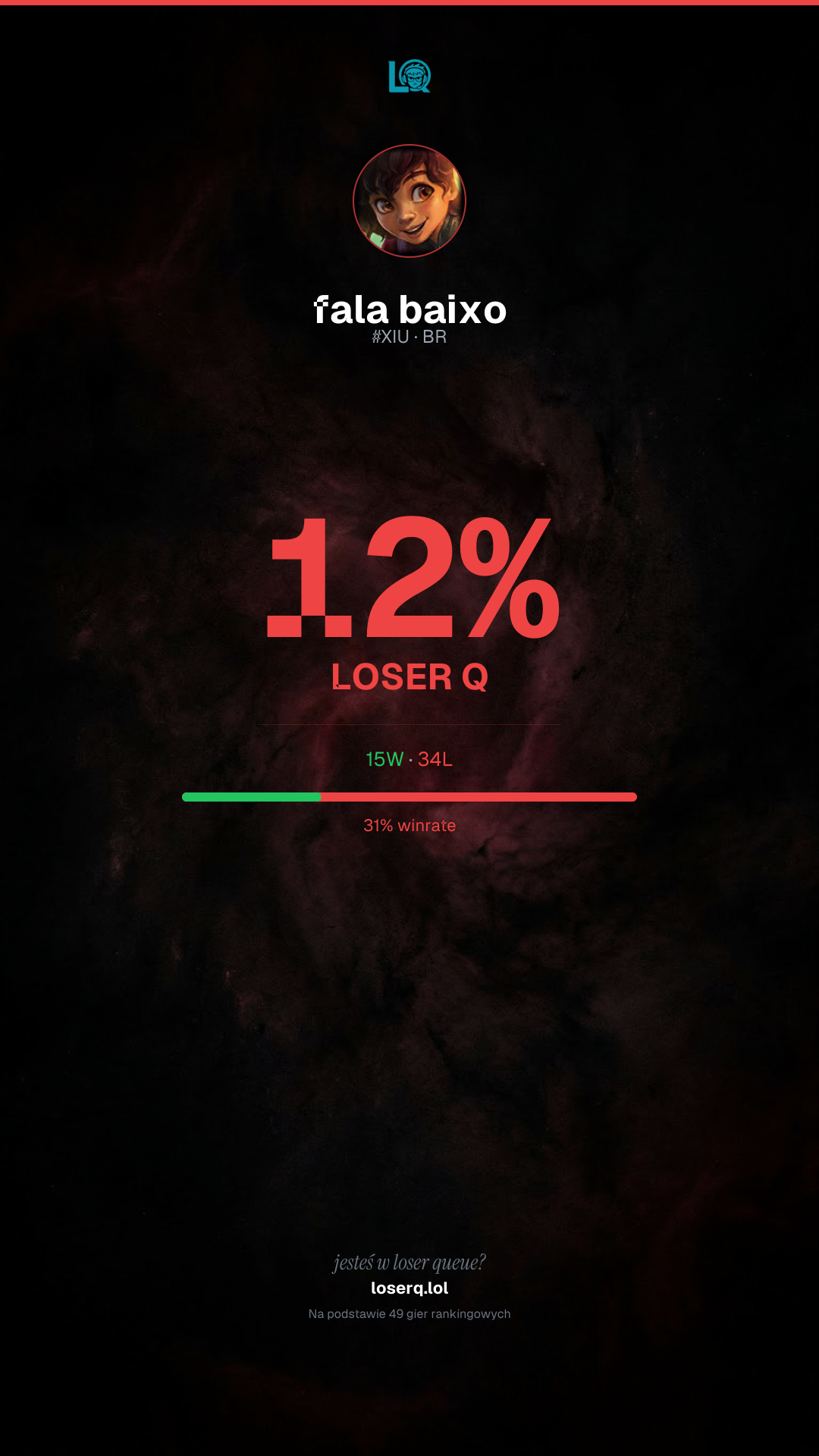 15 zwycięstw, 34 porażek — winrate 30%. Ciężki okres.