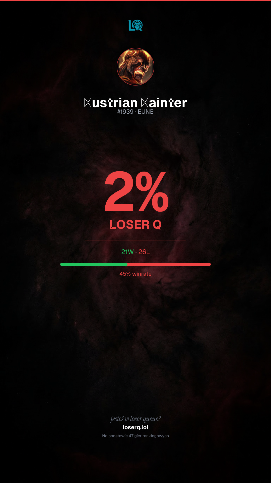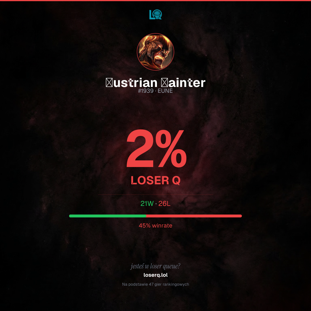 21 zwycięstw, 26 porażek — winrate 44%. Ciężki okres.