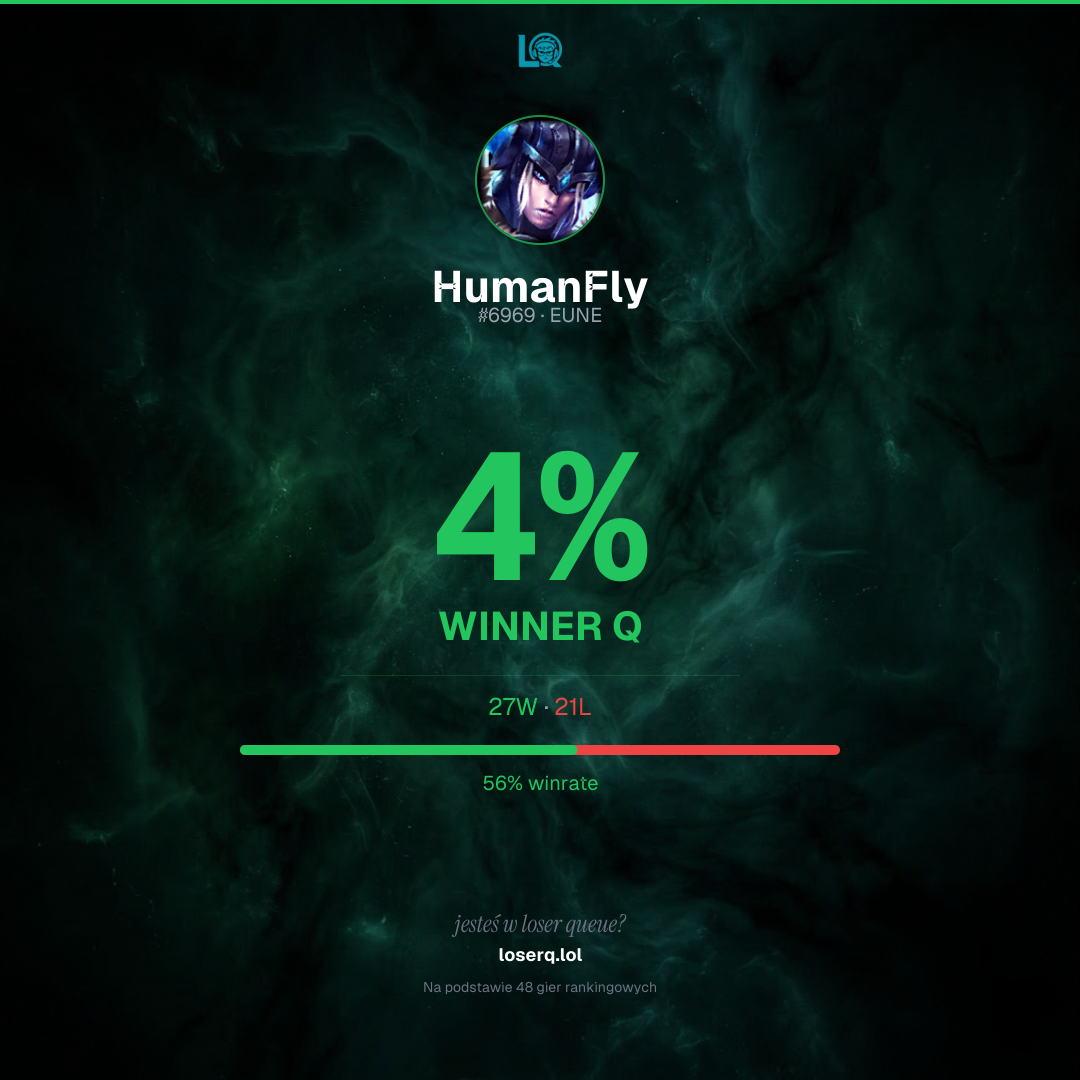 27 zwycięstw, 21 porażek — winrate 56%. Mocny wynik.