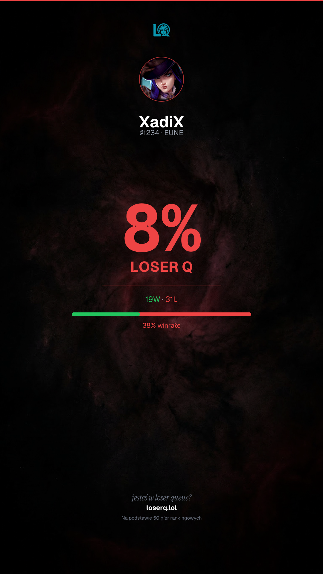 19 zwycięstw, 31 porażek — winrate 38%. Ciężki okres.
