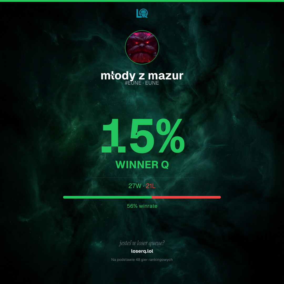 27 zwycięstw, 21 porażek — winrate 56%. Mocny wynik.