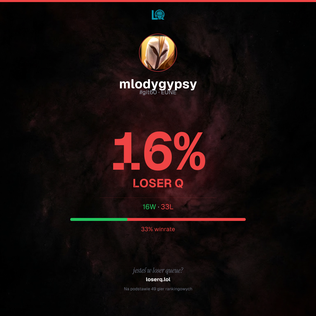16 zwycięstw, 33 porażek — winrate 32%. Ciężki okres.