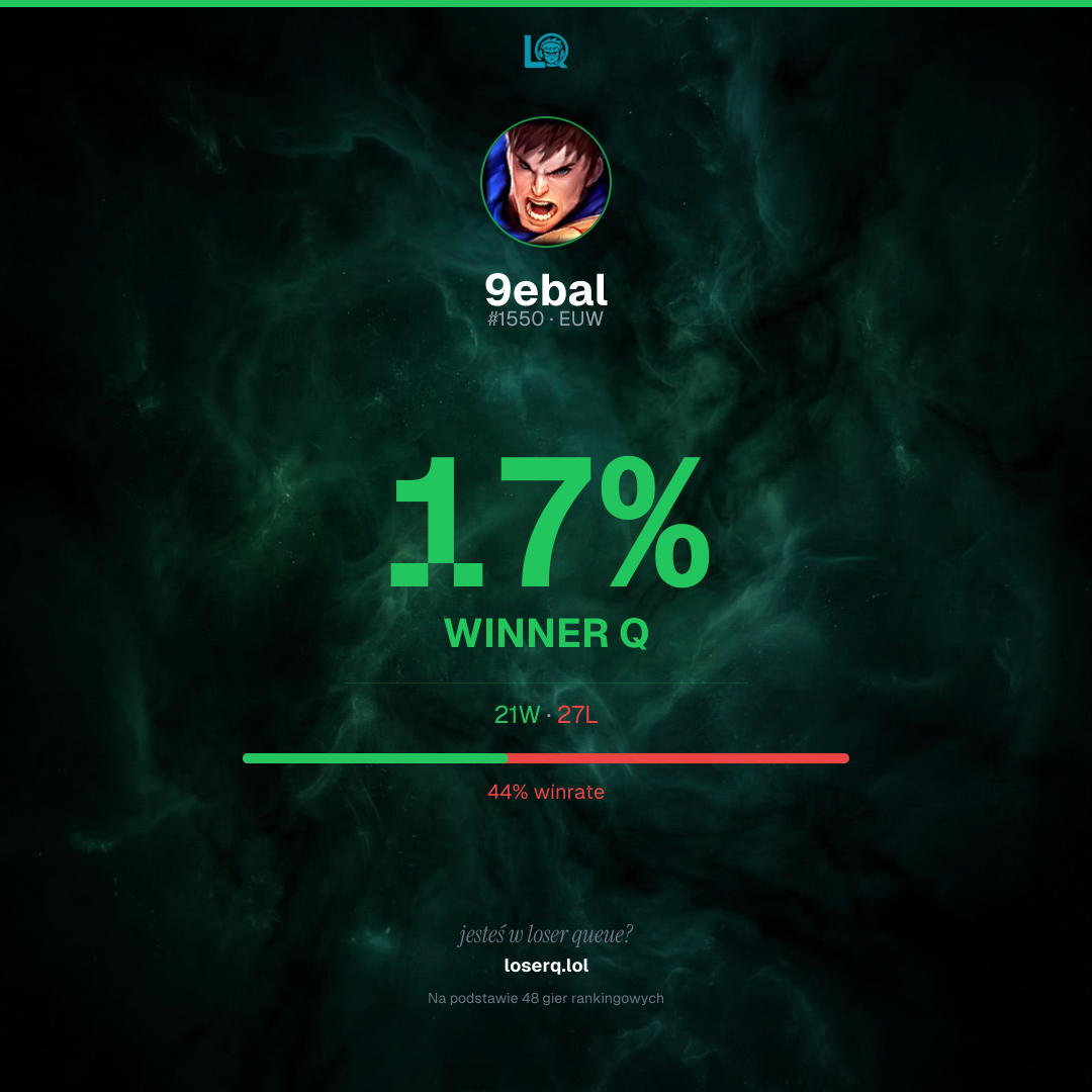 21 zwycięstw, 27 porażek — winrate 43%. Ciężki okres.