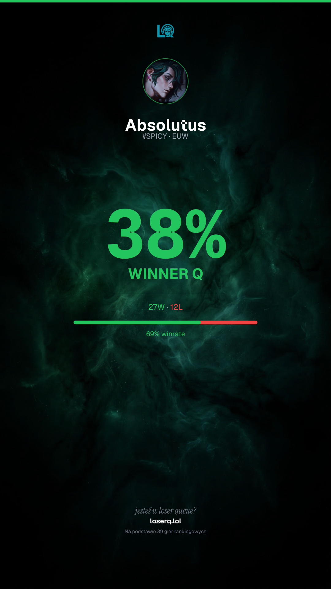 27 zwycięstw, 12 porażek — winrate 69%. Mocny wynik.