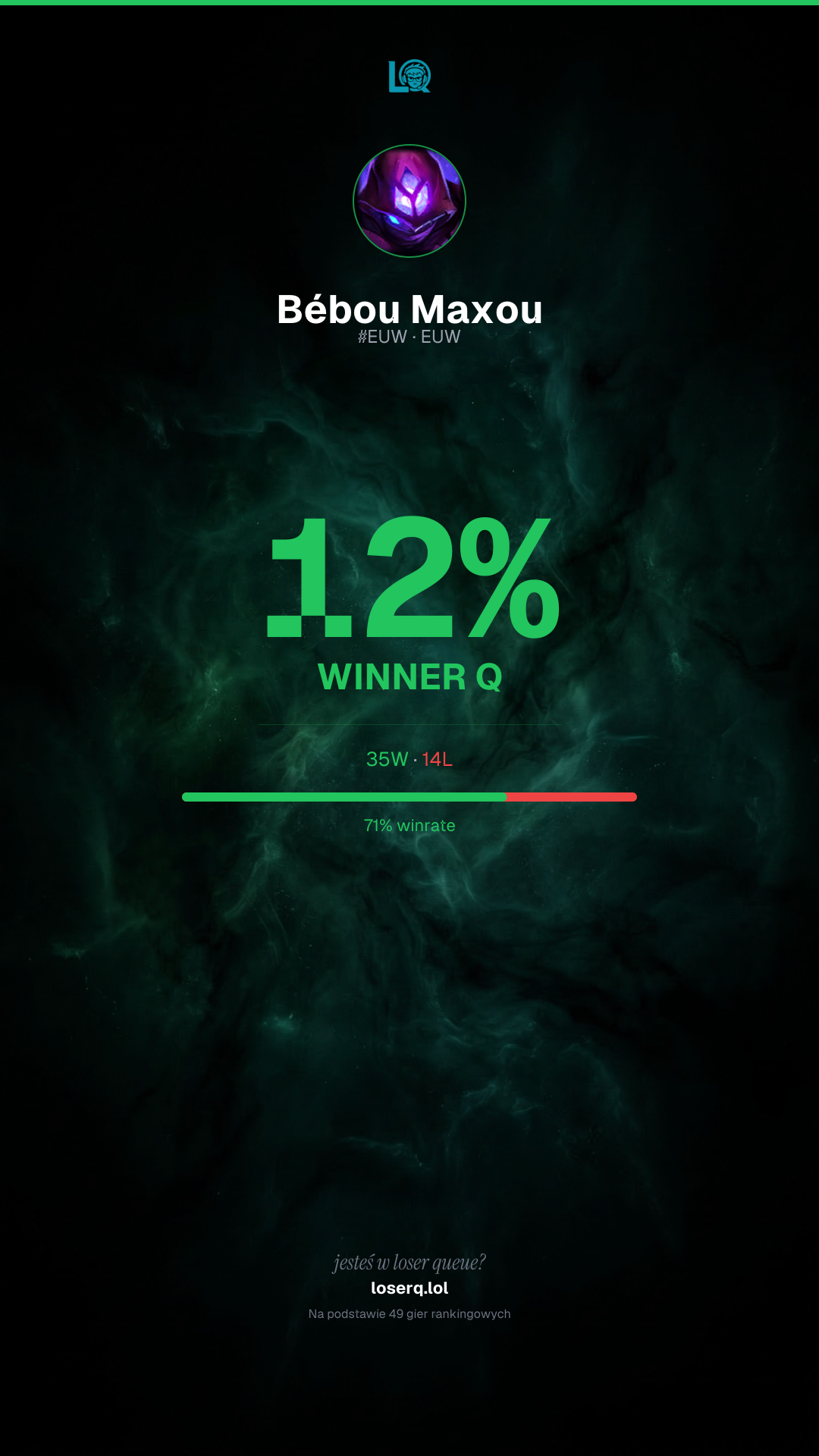 35 zwycięstw, 14 porażek — winrate 71%. Mocny wynik.