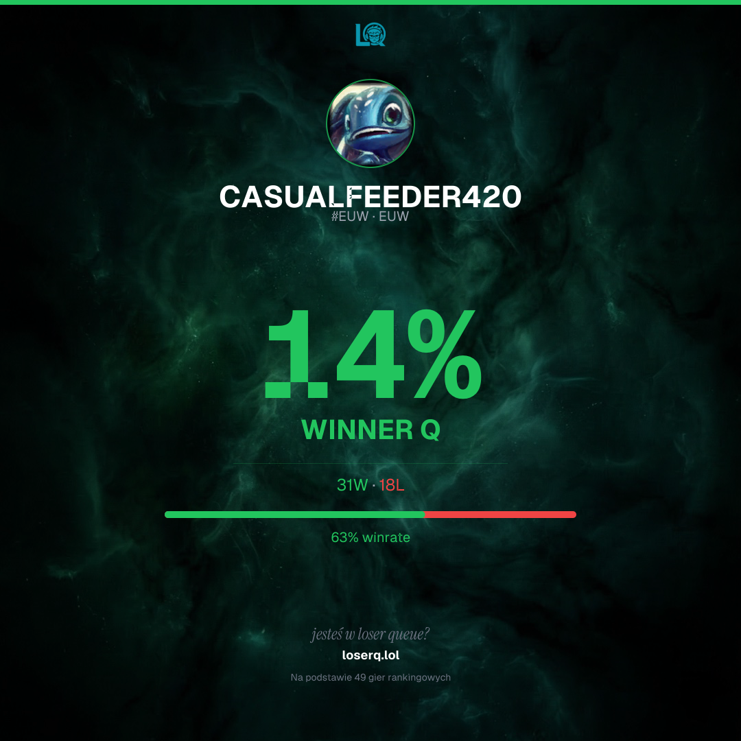31 zwycięstw, 18 porażek — winrate 63%. Mocny wynik.