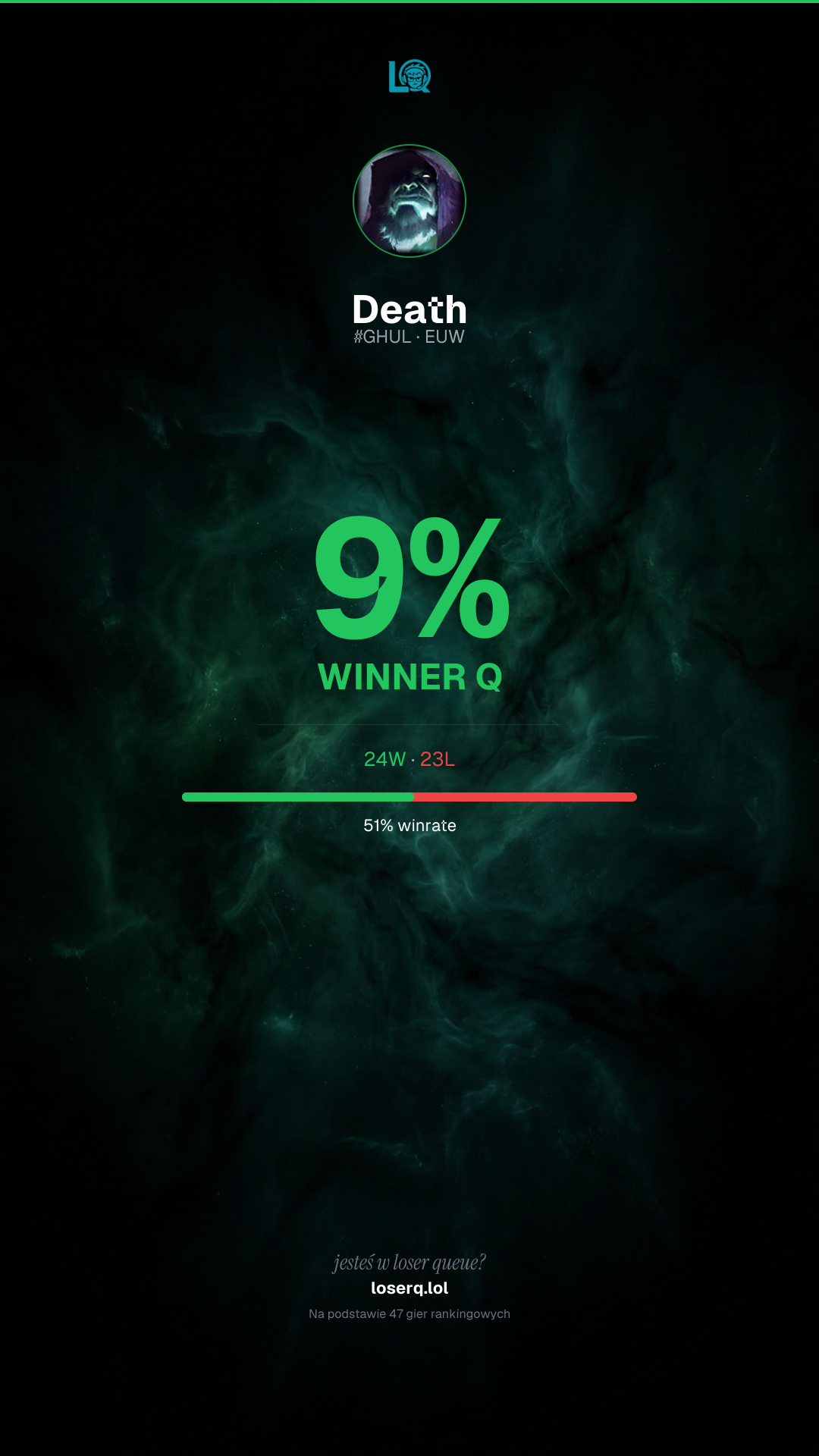 24 zwycięstw, 23 porażek — winrate 51%.