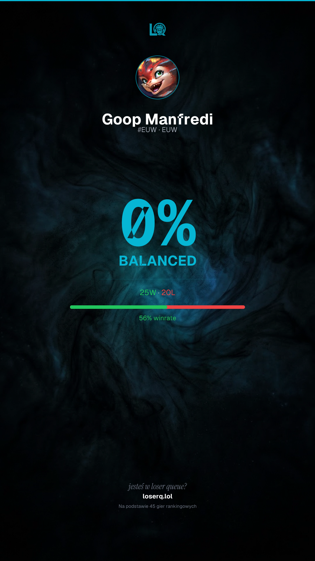 25 zwycięstw, 20 porażek — winrate 55%. Mocny wynik.
