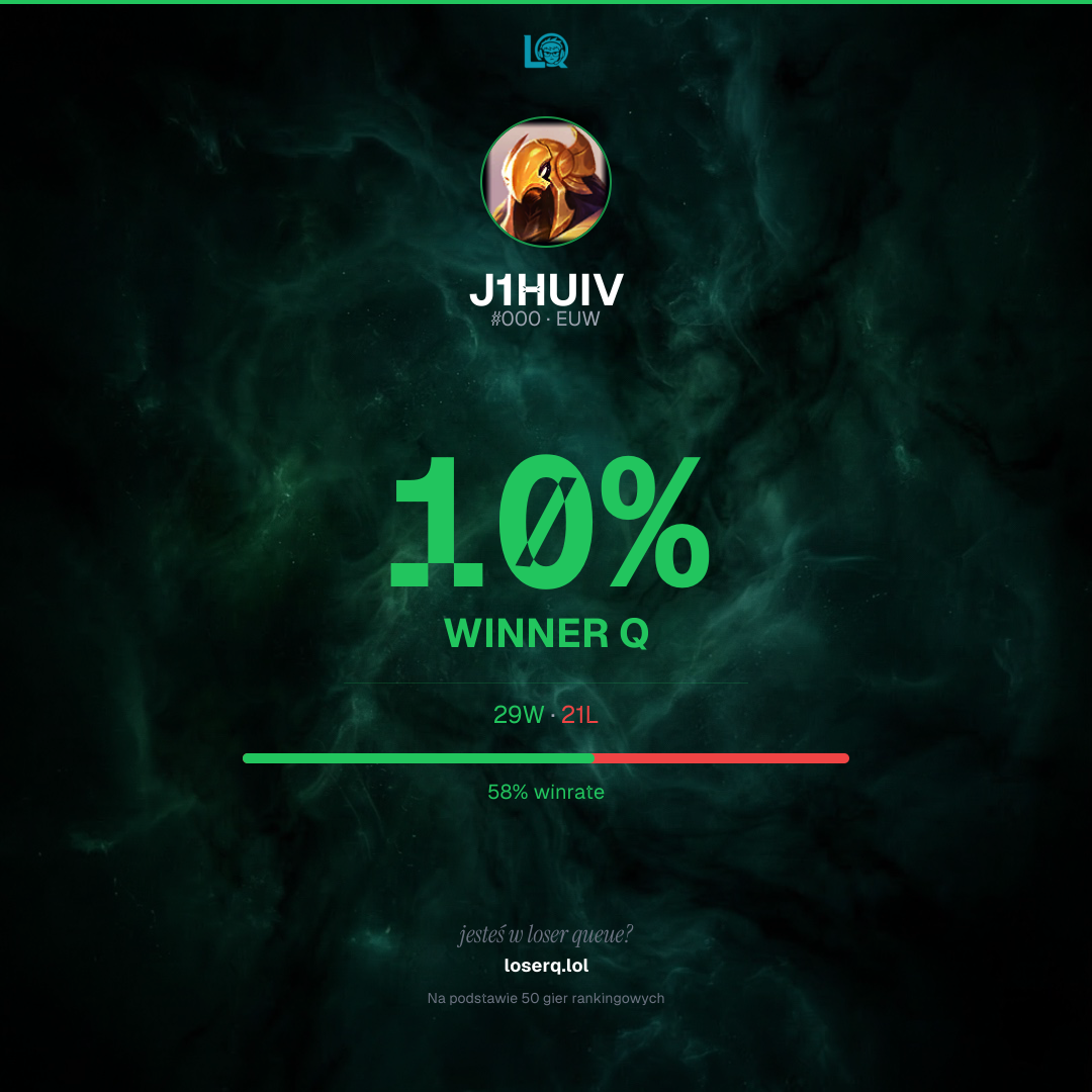 29 zwycięstw, 21 porażek — winrate 58%. Mocny wynik.