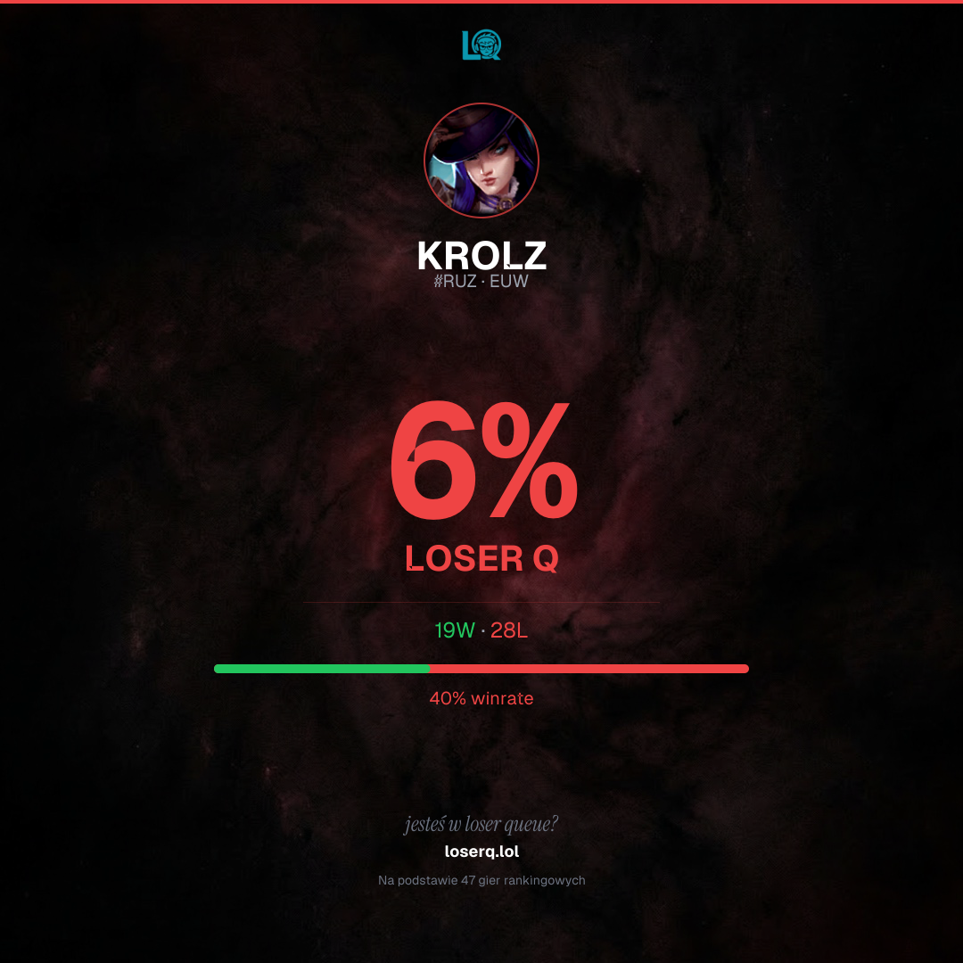 19 zwycięstw, 28 porażek — winrate 40%. Ciężki okres.