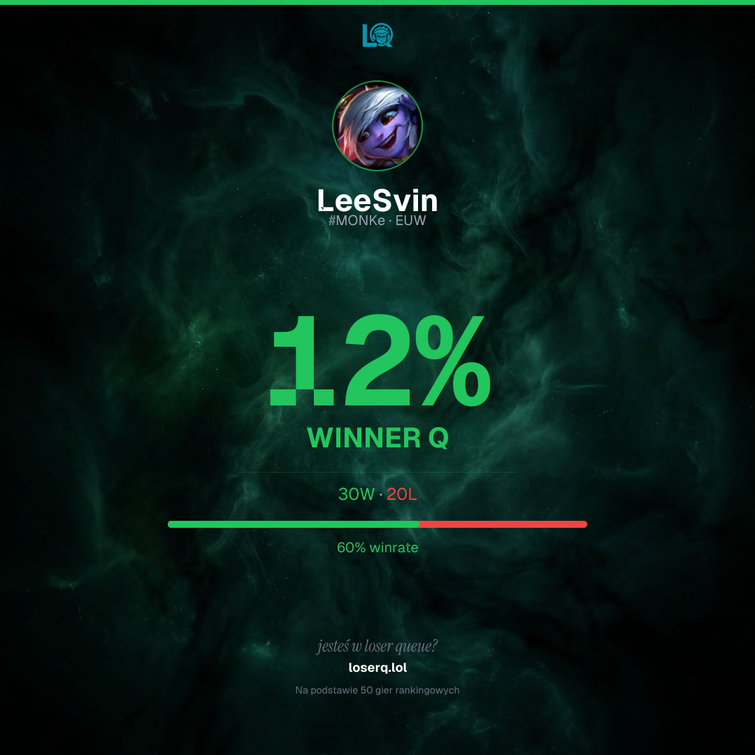 30 zwycięstw, 20 porażek — winrate 60%. Mocny wynik.