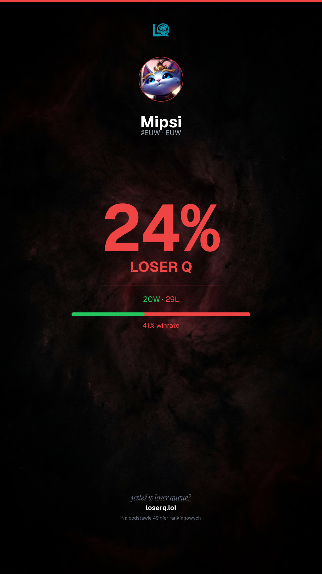 20 zwycięstw, 29 porażek — winrate 40%. Ciężki okres.