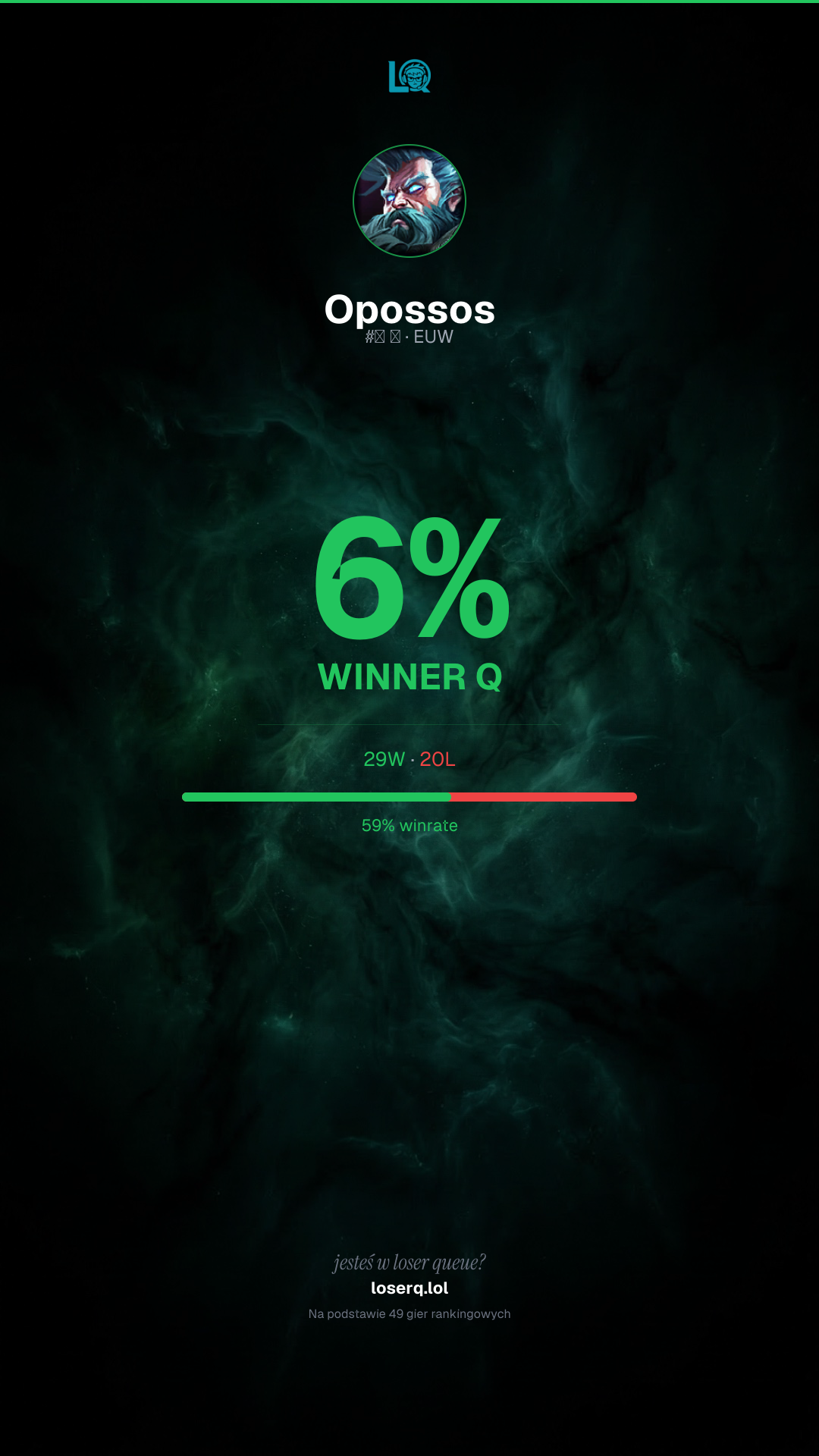 29 zwycięstw, 20 porażek — winrate 59%. Mocny wynik.