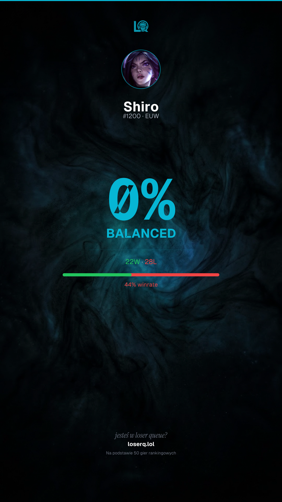 22 zwycięstw, 28 porażek — winrate 44%. Ciężki okres.