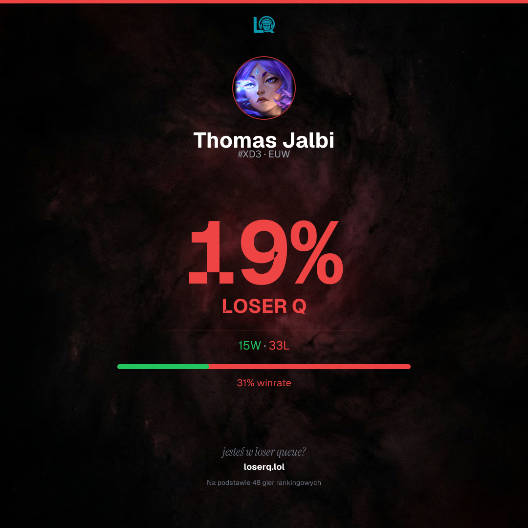 15 zwycięstw, 33 porażek — winrate 31%. Ciężki okres.