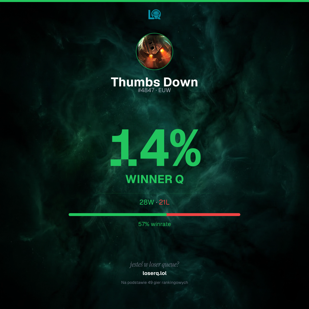 28 zwycięstw, 21 porażek — winrate 57%. Mocny wynik.