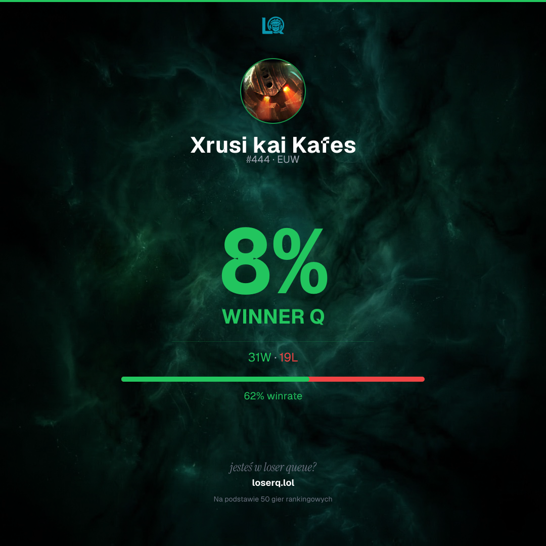 31 zwycięstw, 19 porażek — winrate 62%. Mocny wynik.
