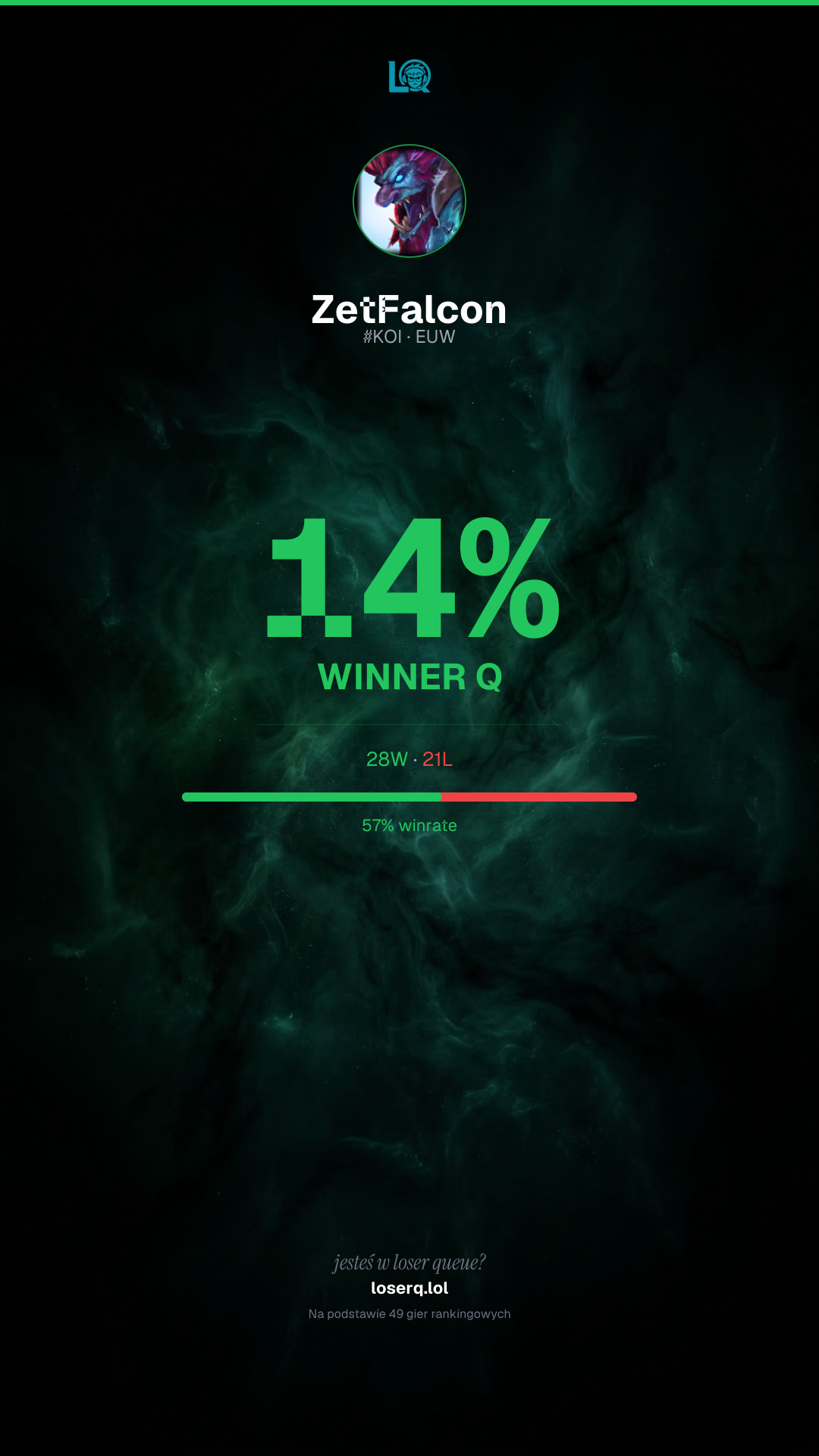 28 zwycięstw, 21 porażek — winrate 57%. Mocny wynik.