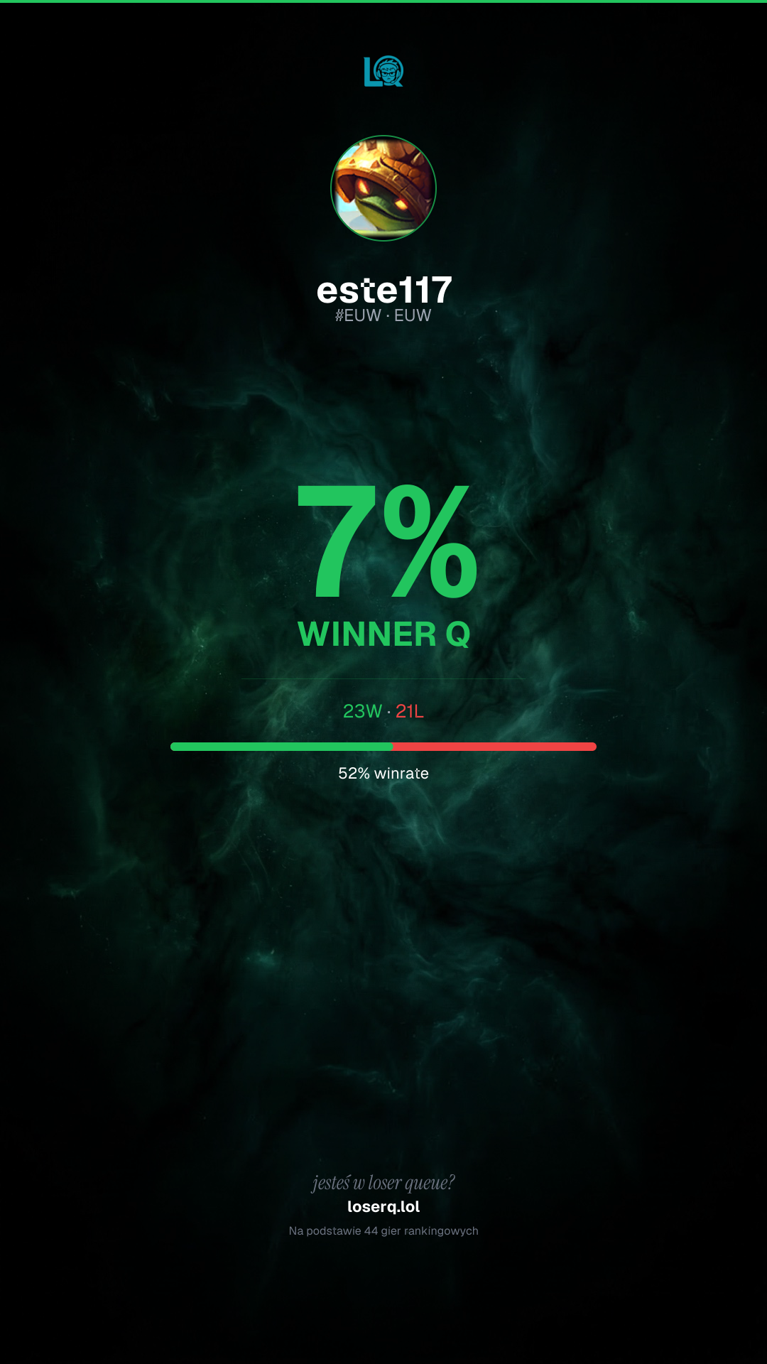 23 zwycięstw, 21 porażek — winrate 52%.