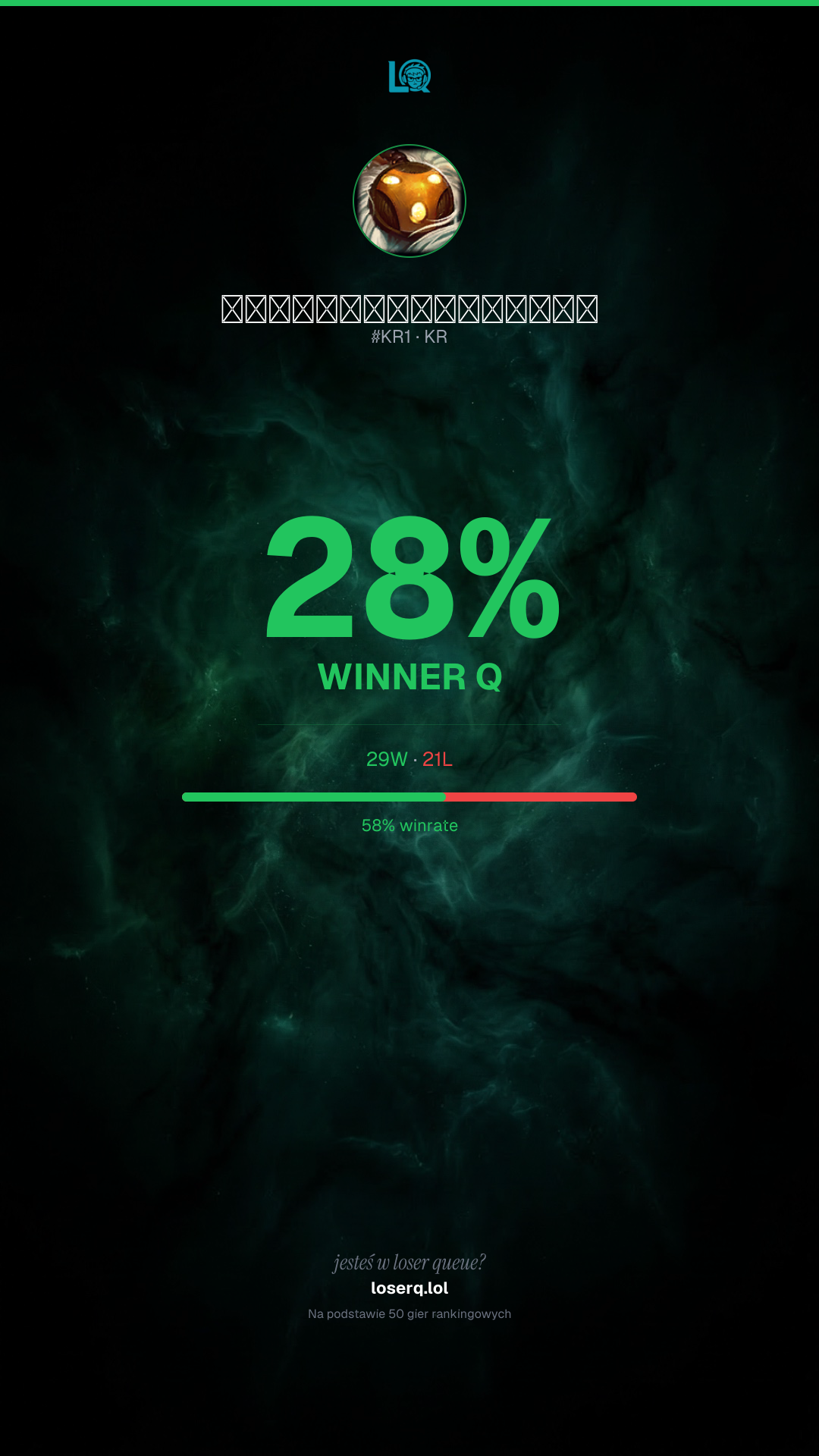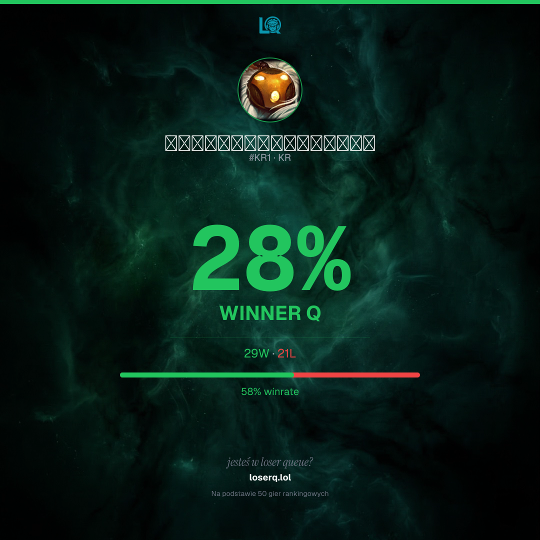 29 zwycięstw, 21 porażek — winrate 58%. Mocny wynik.