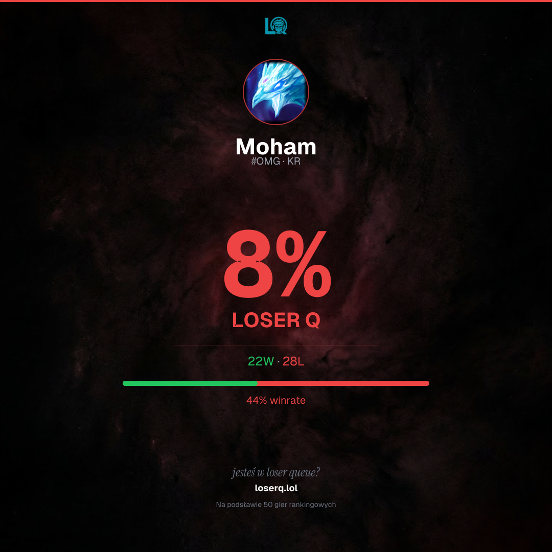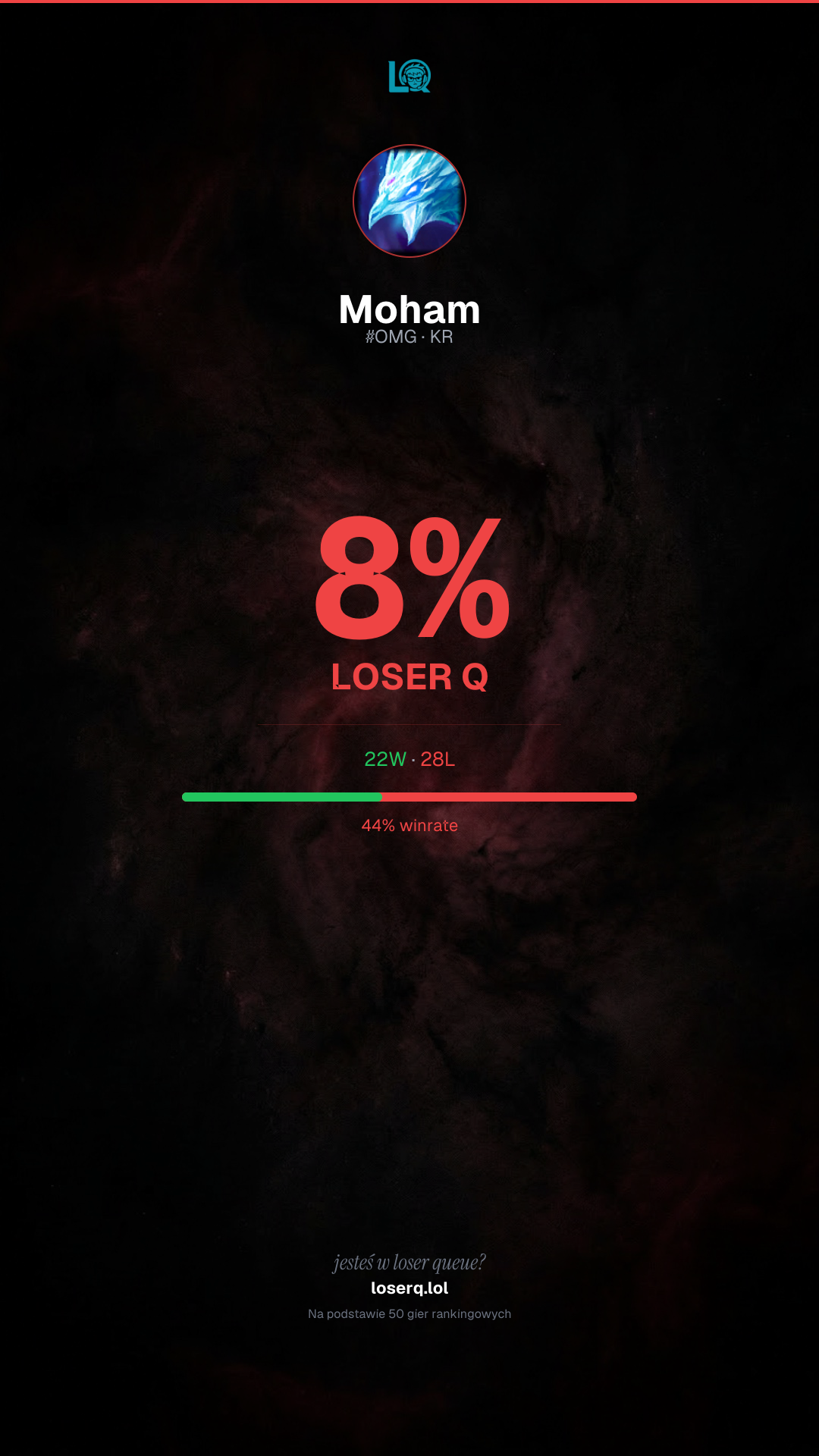 22 zwycięstw, 28 porażek — winrate 44%. Ciężki okres.