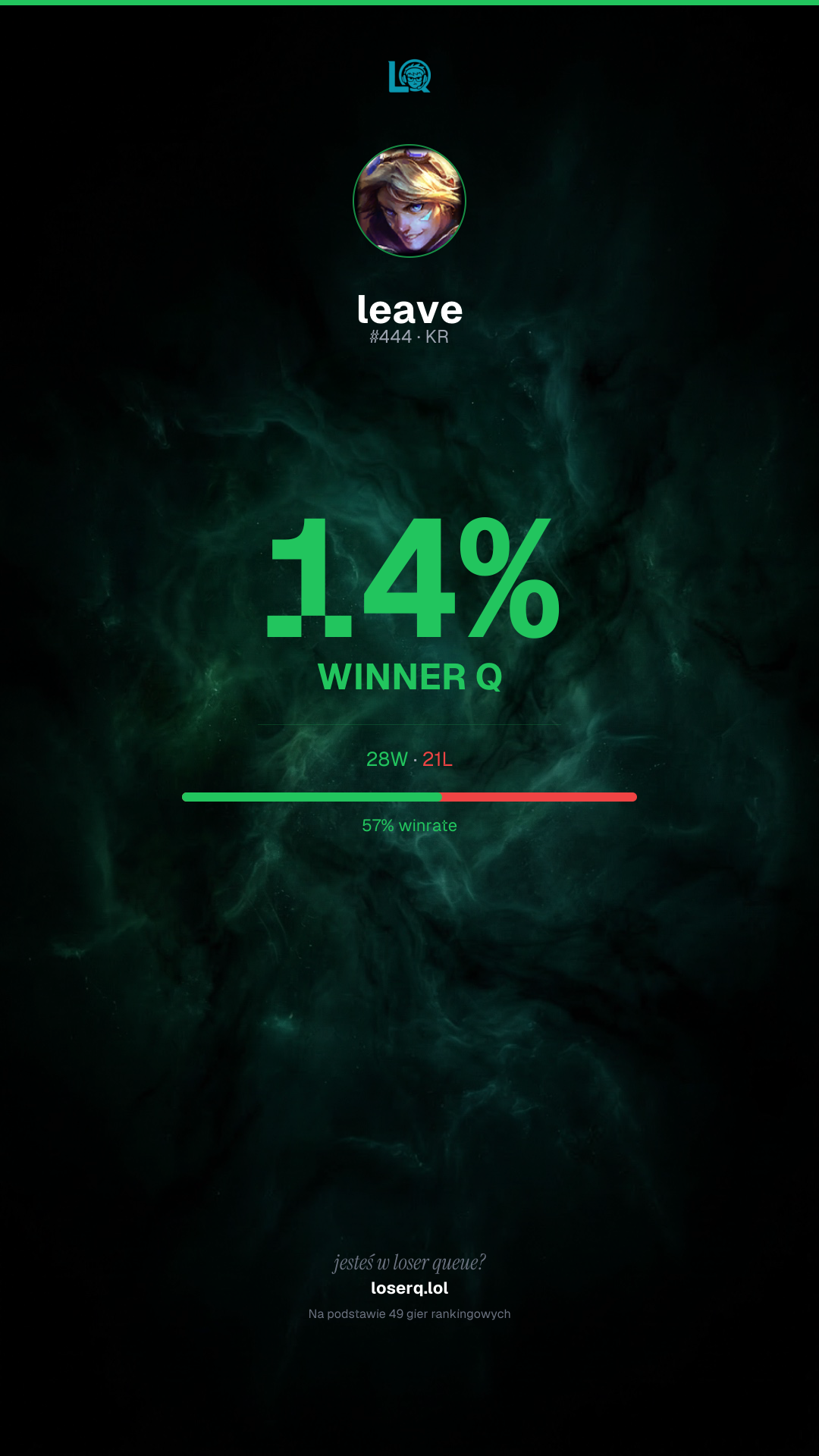 28 zwycięstw, 21 porażek — winrate 57%. Mocny wynik.