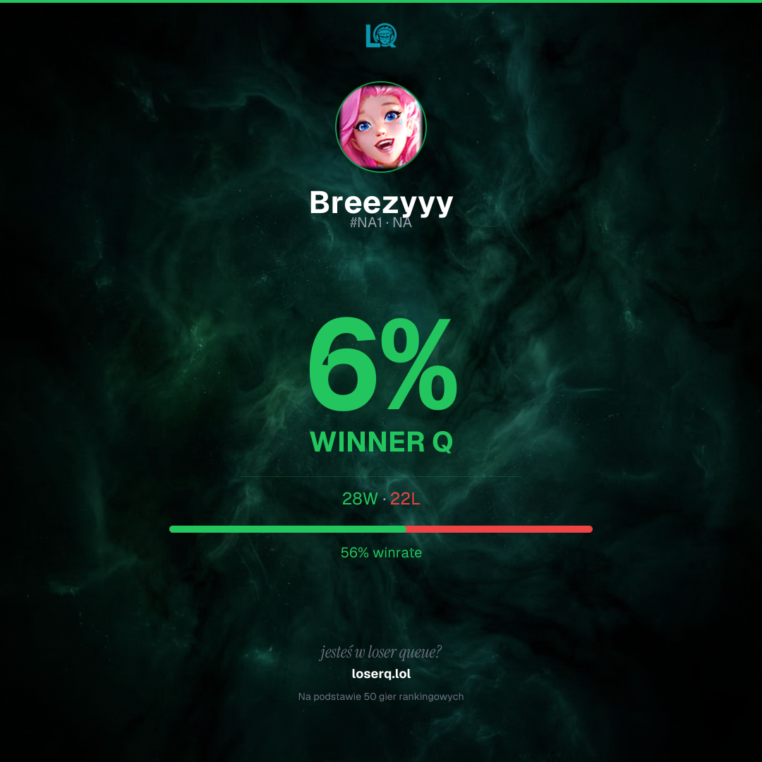 28 zwycięstw, 22 porażek — winrate 56%. Mocny wynik.