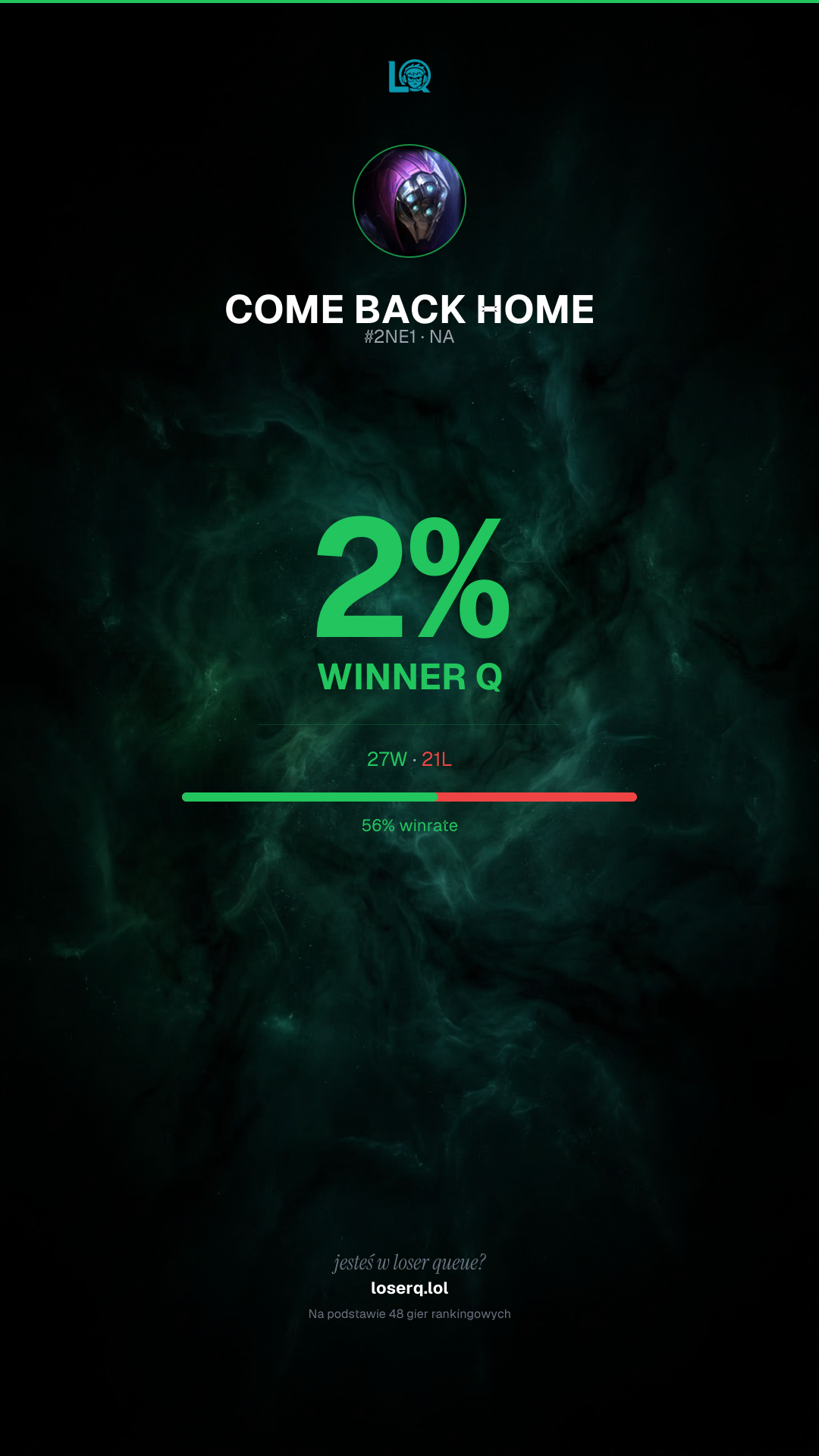 27 zwycięstw, 21 porażek — winrate 56%. Mocny wynik.