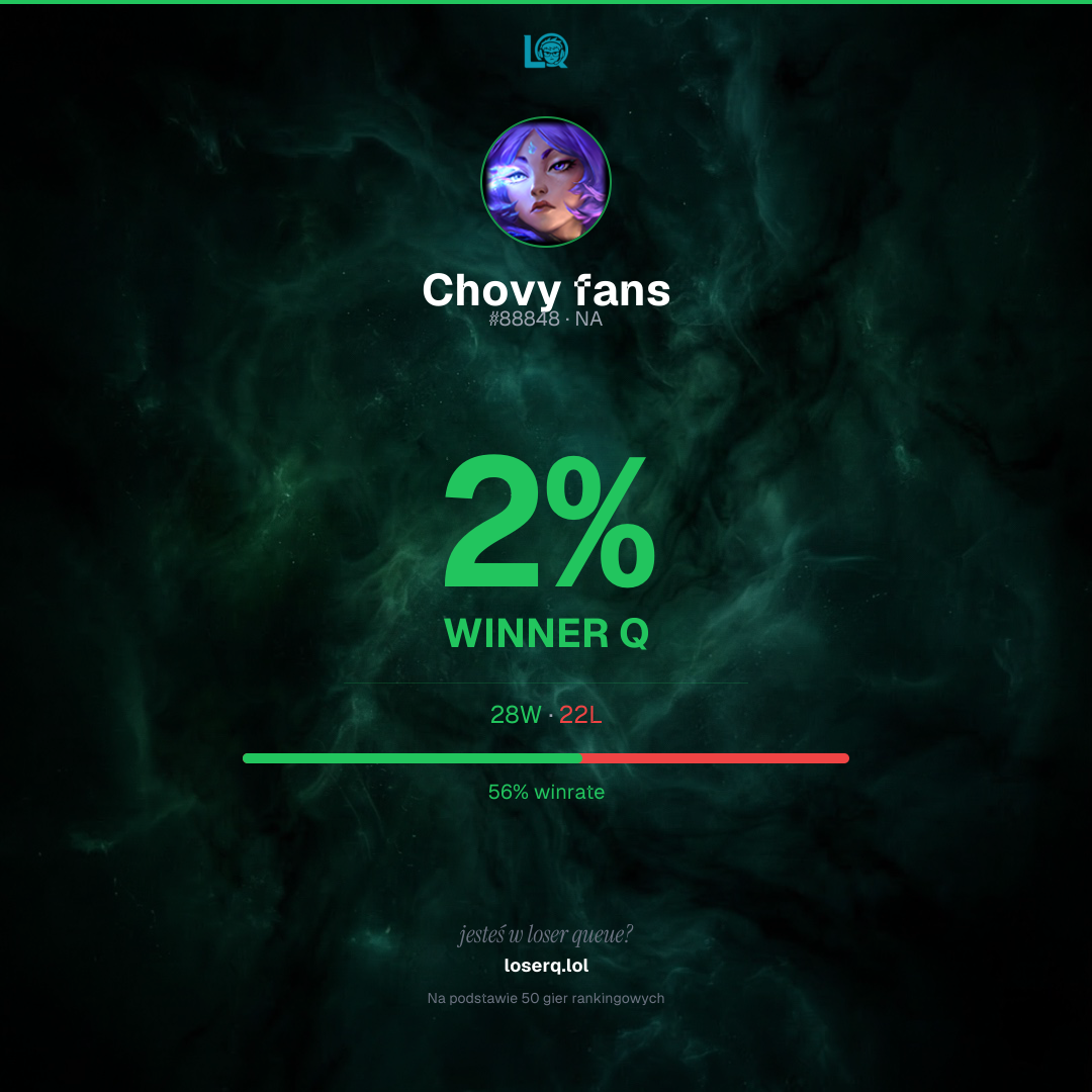 28 zwycięstw, 22 porażek — winrate 56%. Mocny wynik.