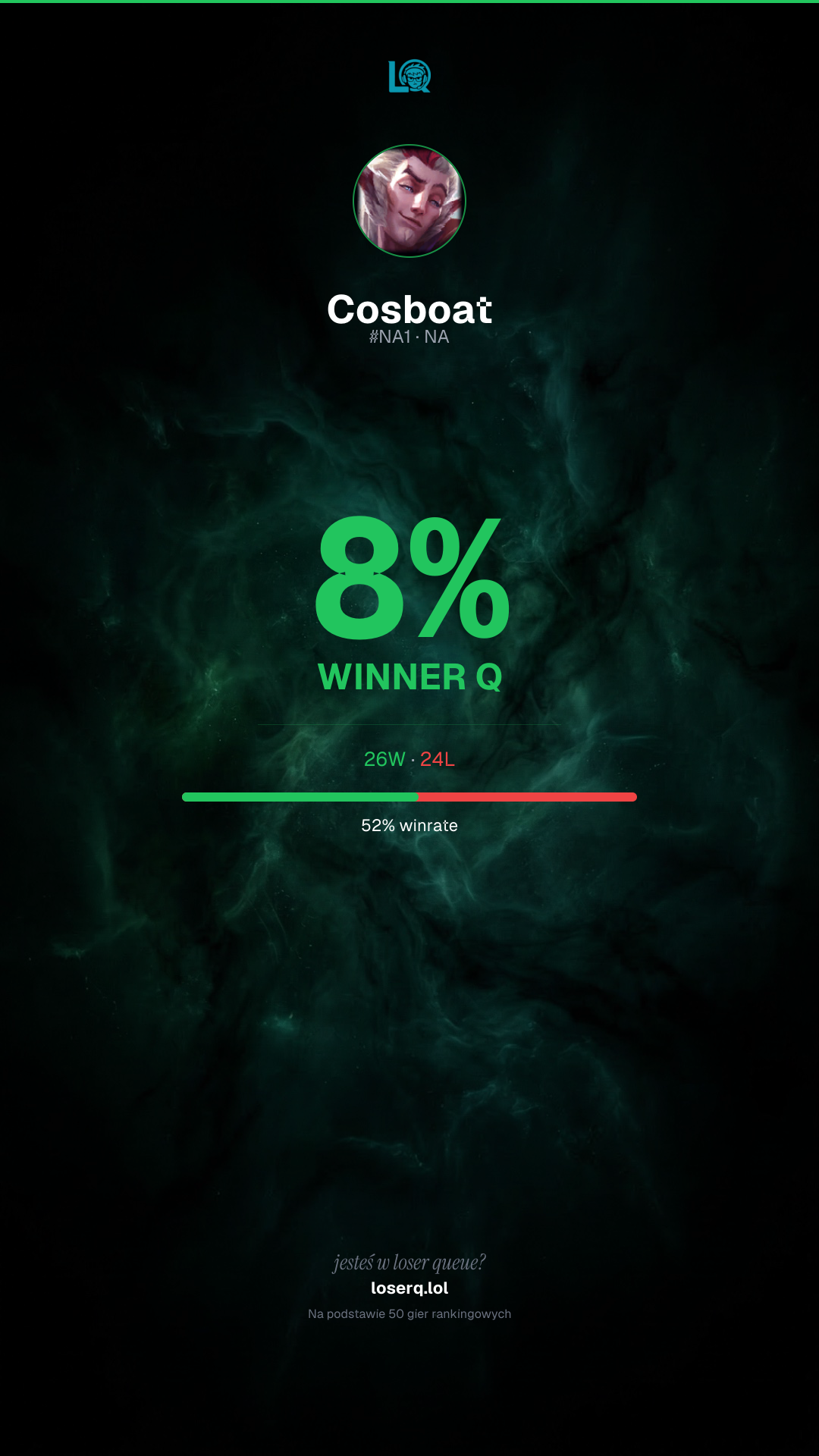 26 zwycięstw, 24 porażek — winrate 52%.