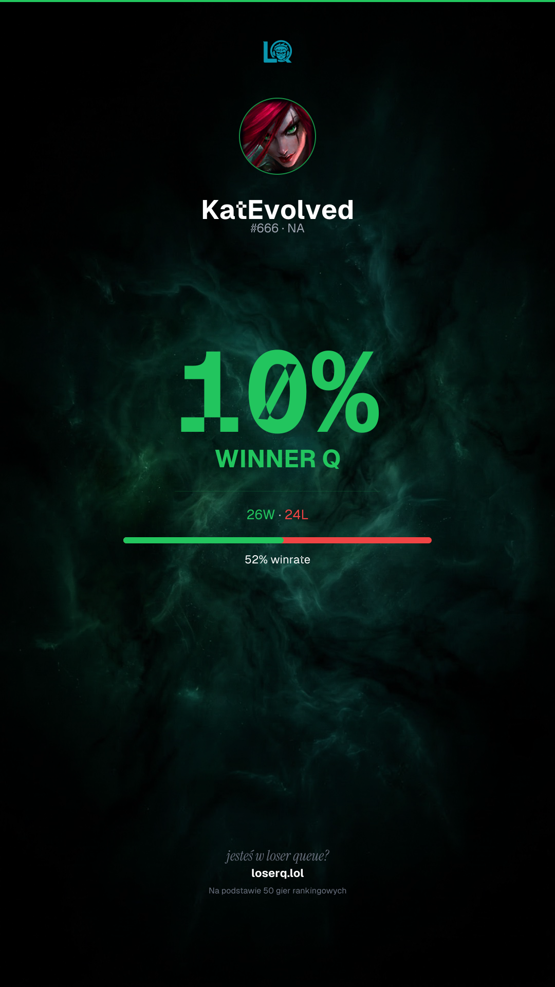 26 zwycięstw, 24 porażek — winrate 52%.