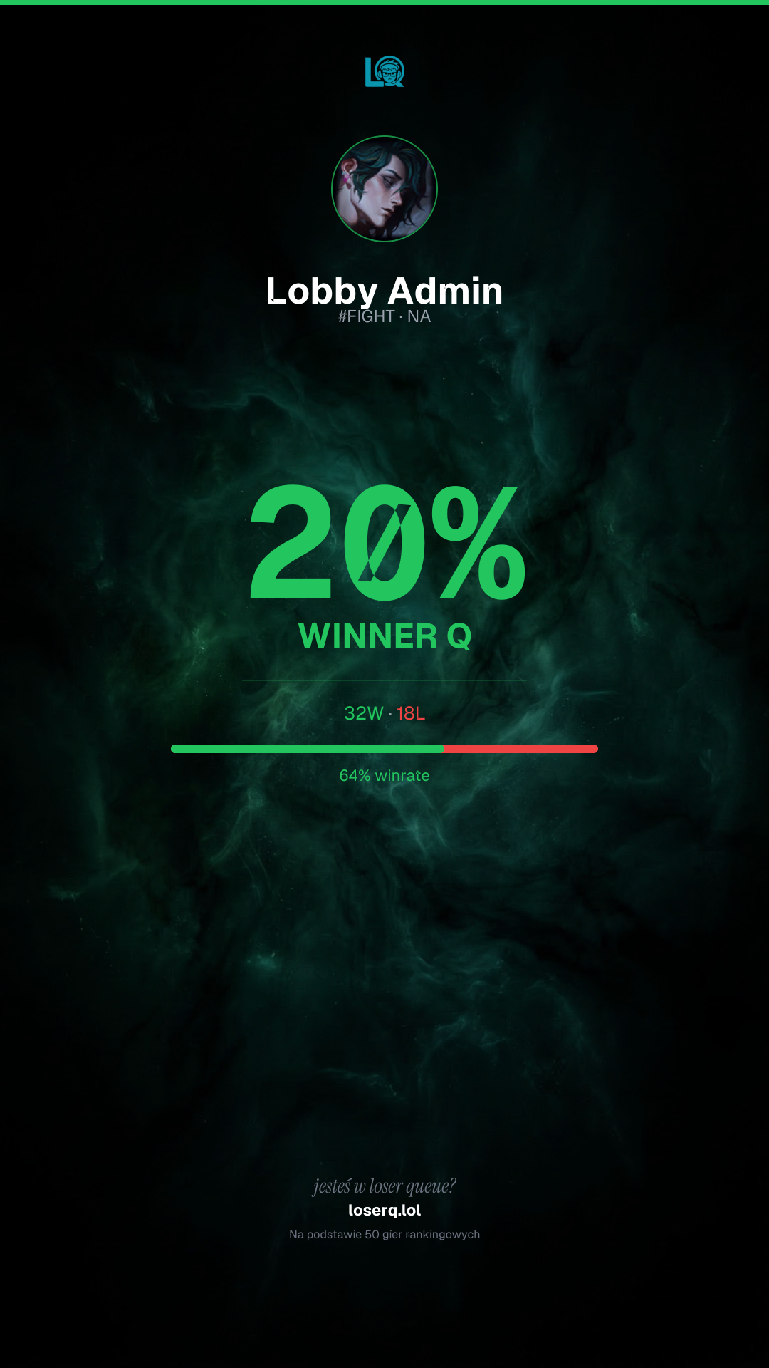 32 zwycięstw, 18 porażek — winrate 64%. Mocny wynik.