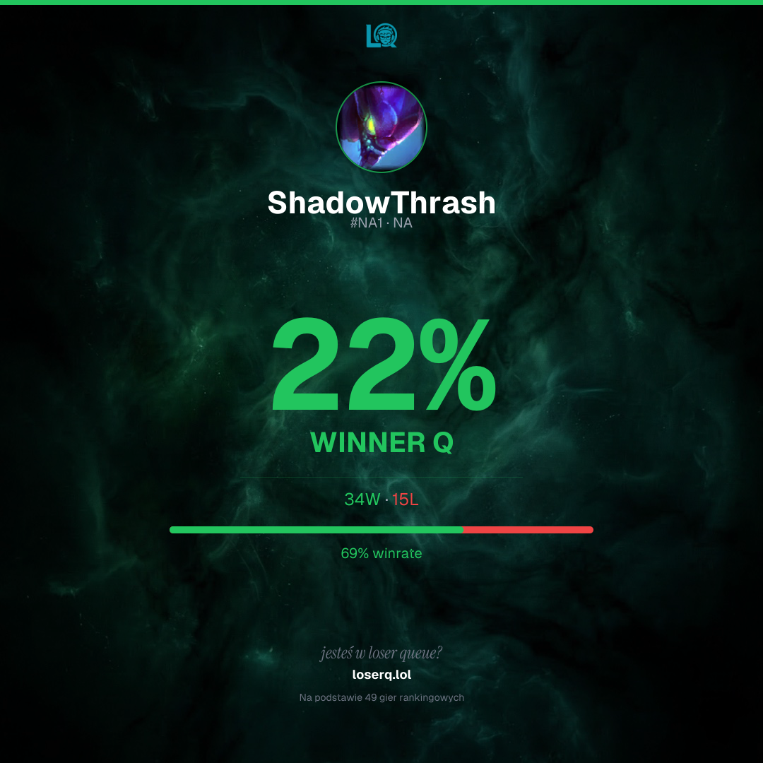 34 zwycięstw, 15 porażek — winrate 69%. Mocny wynik.