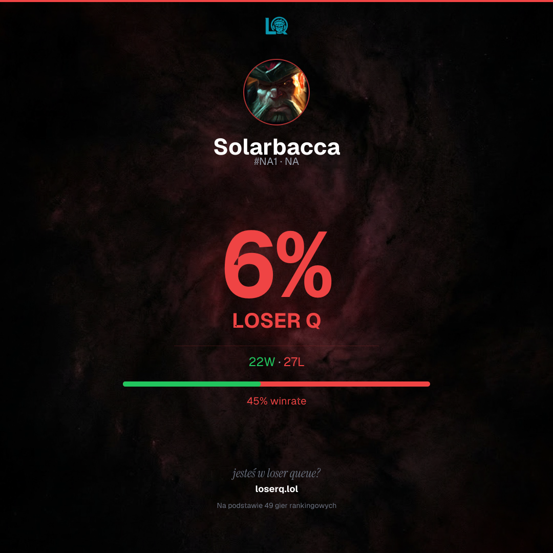 22 zwycięstw, 27 porażek — winrate 44%. Ciężki okres.