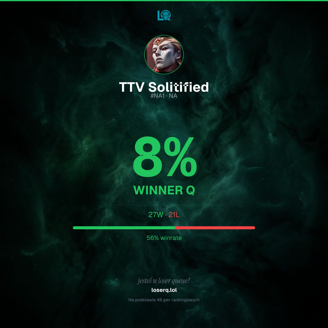 27 zwycięstw, 21 porażek — winrate 56%. Mocny wynik.