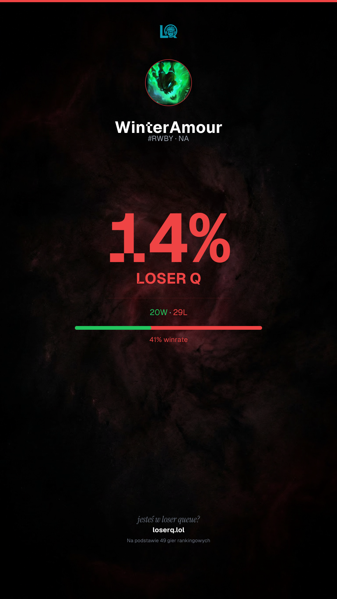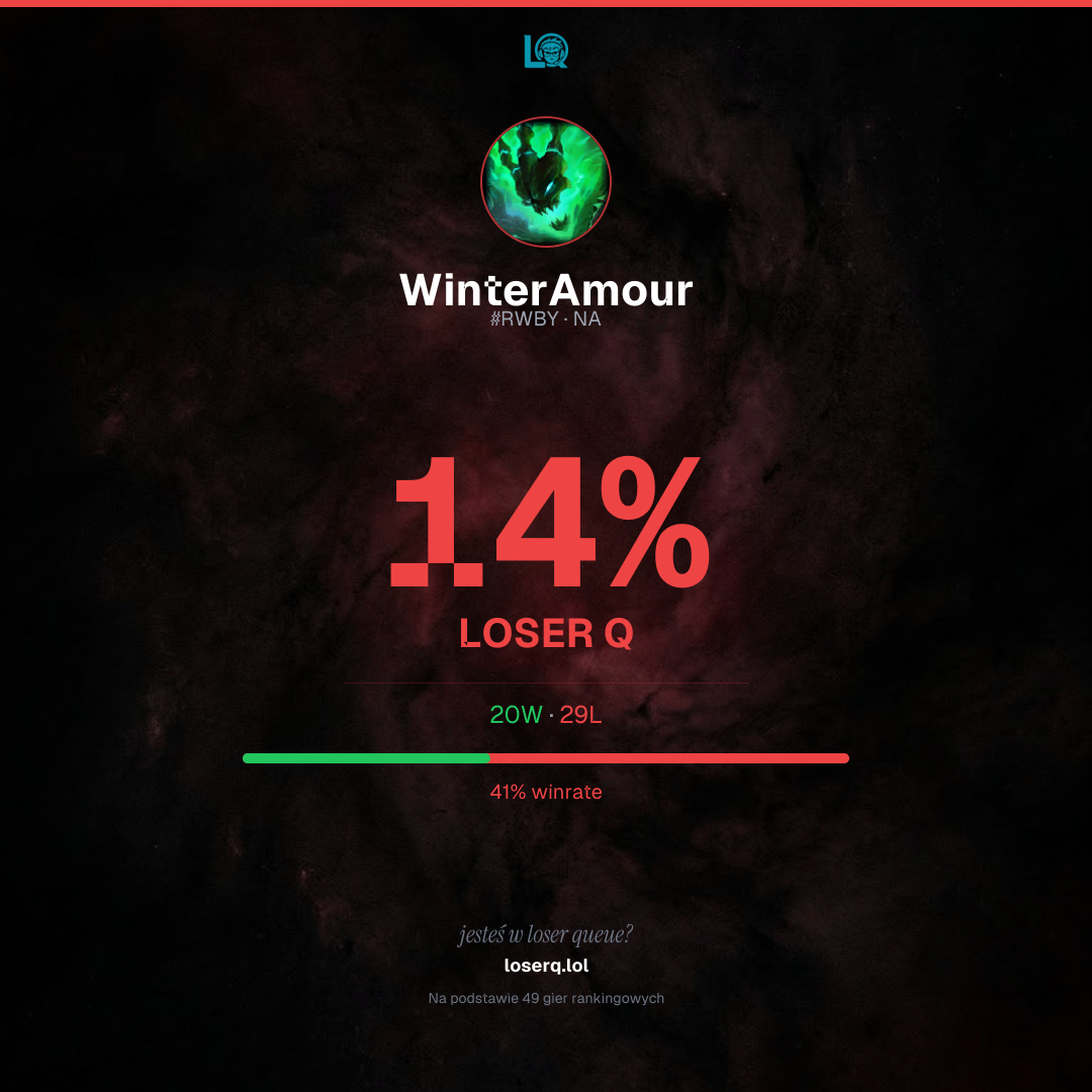 20 zwycięstw, 29 porażek — winrate 40%. Ciężki okres.